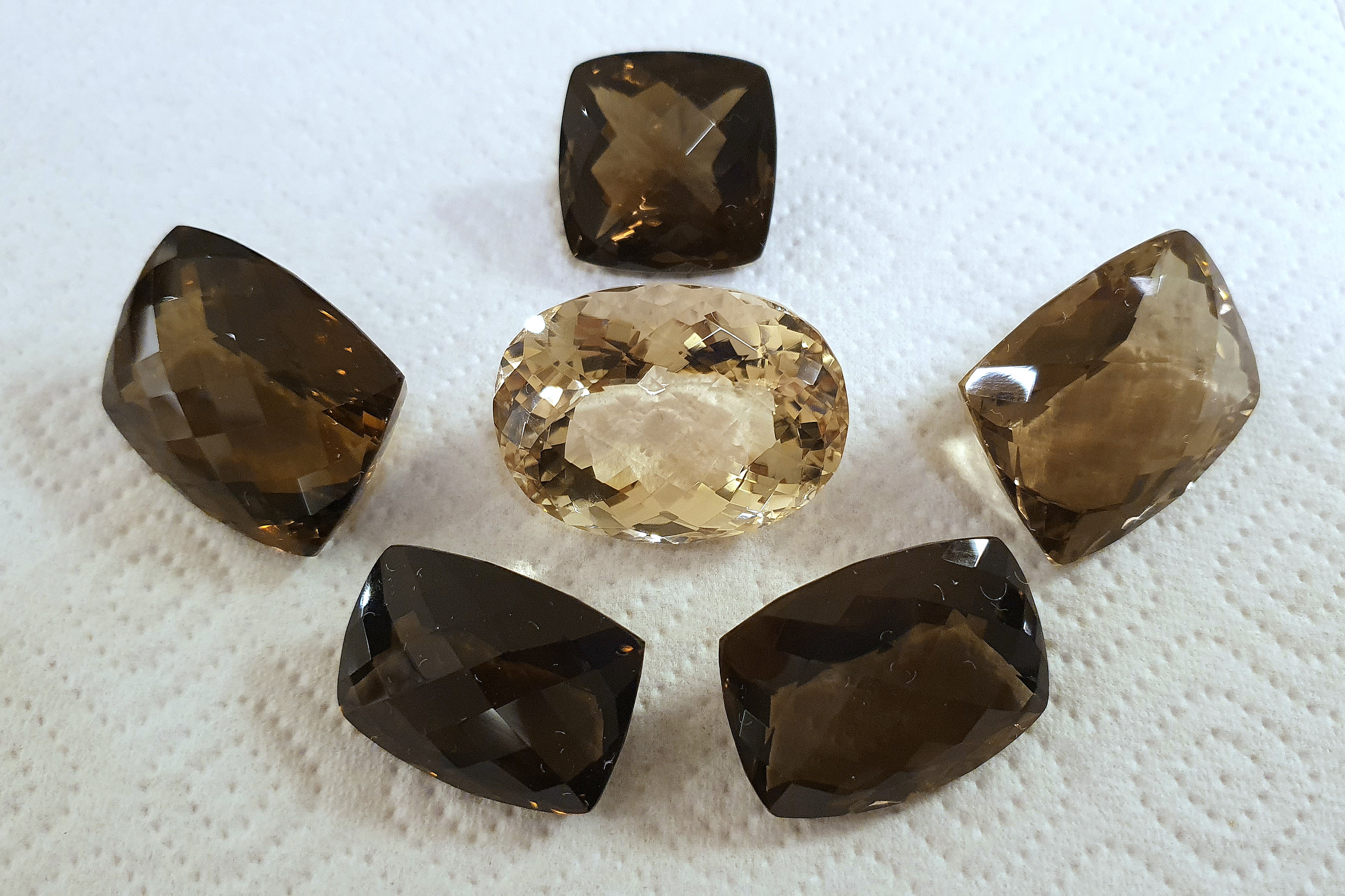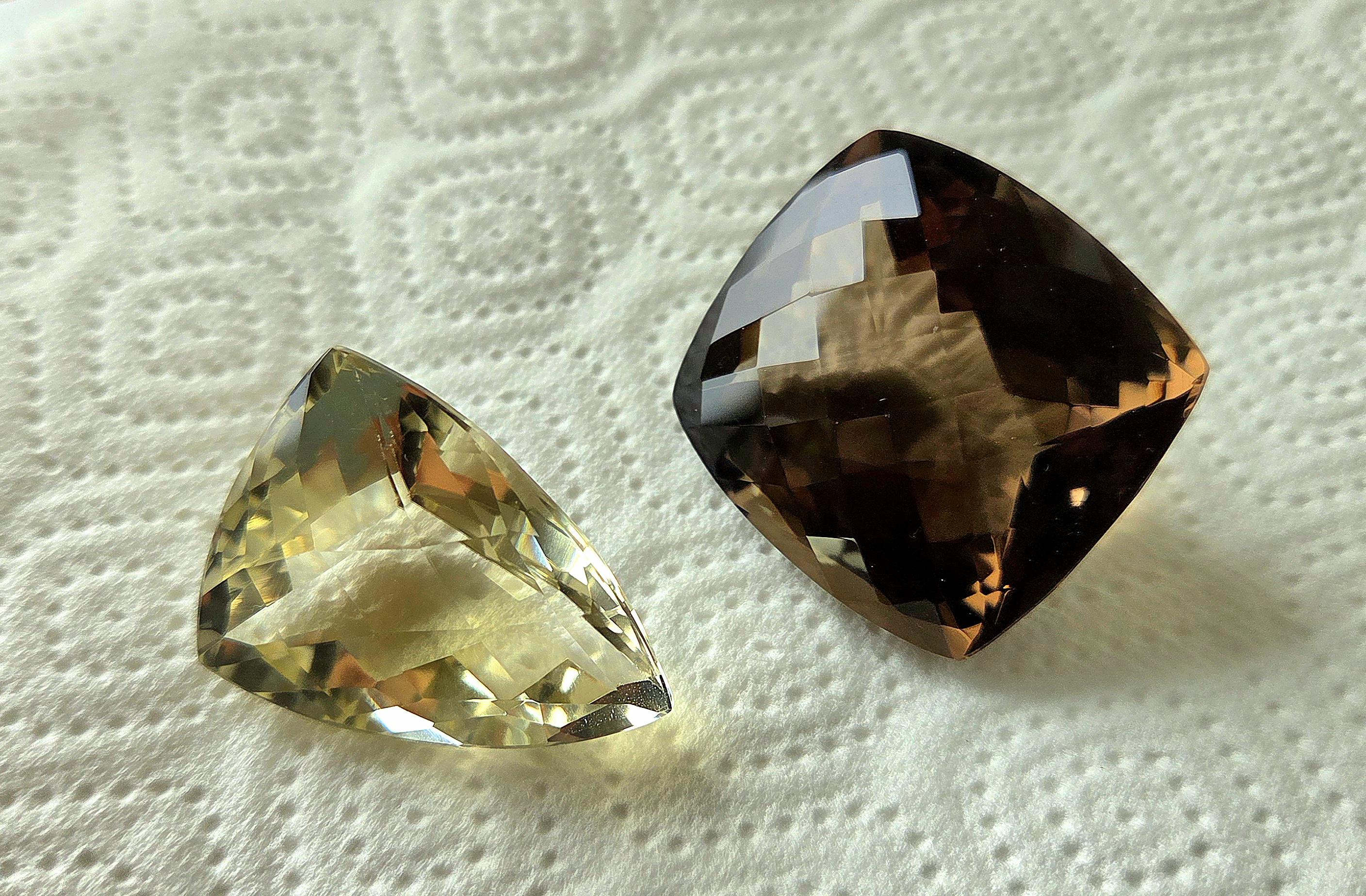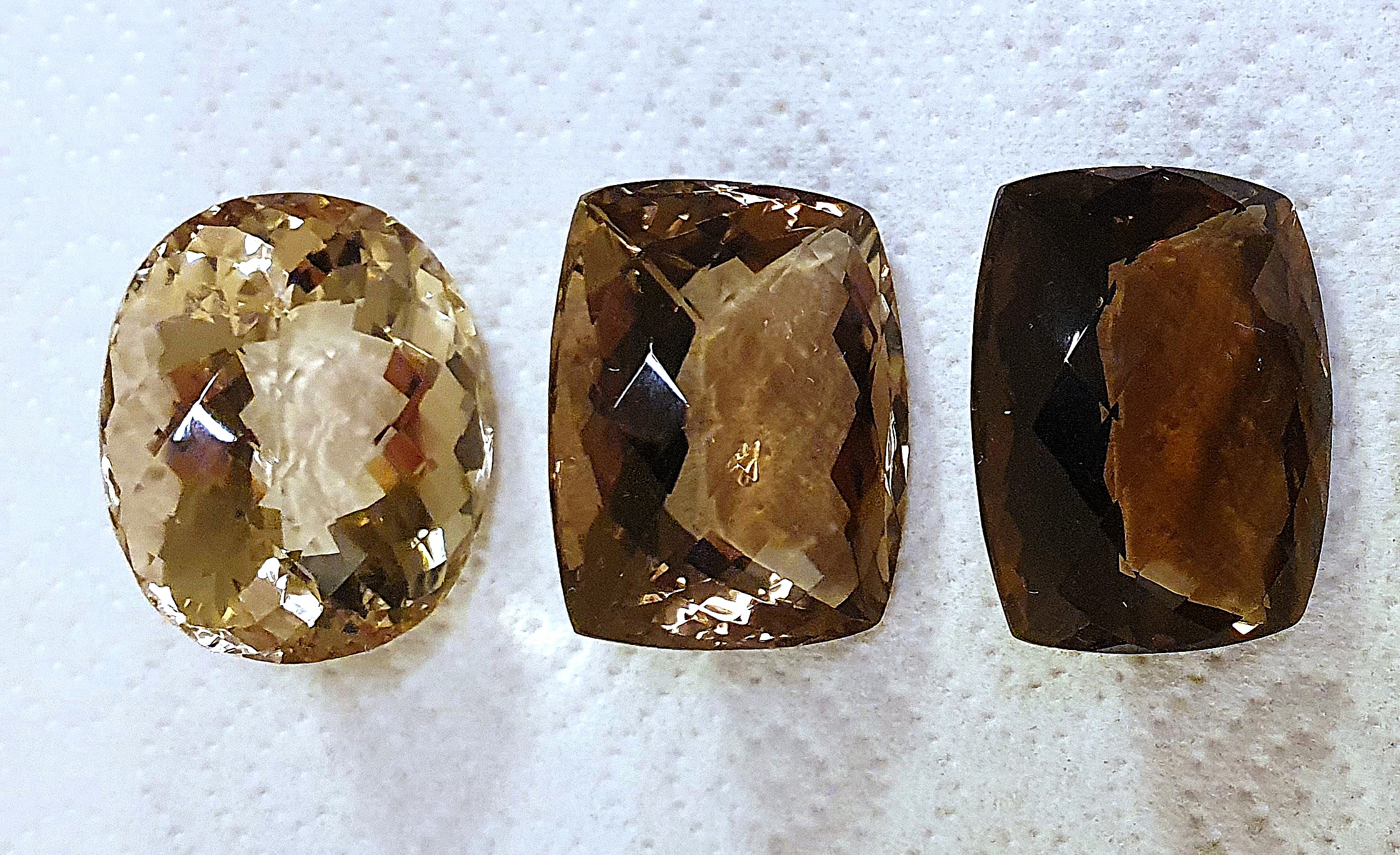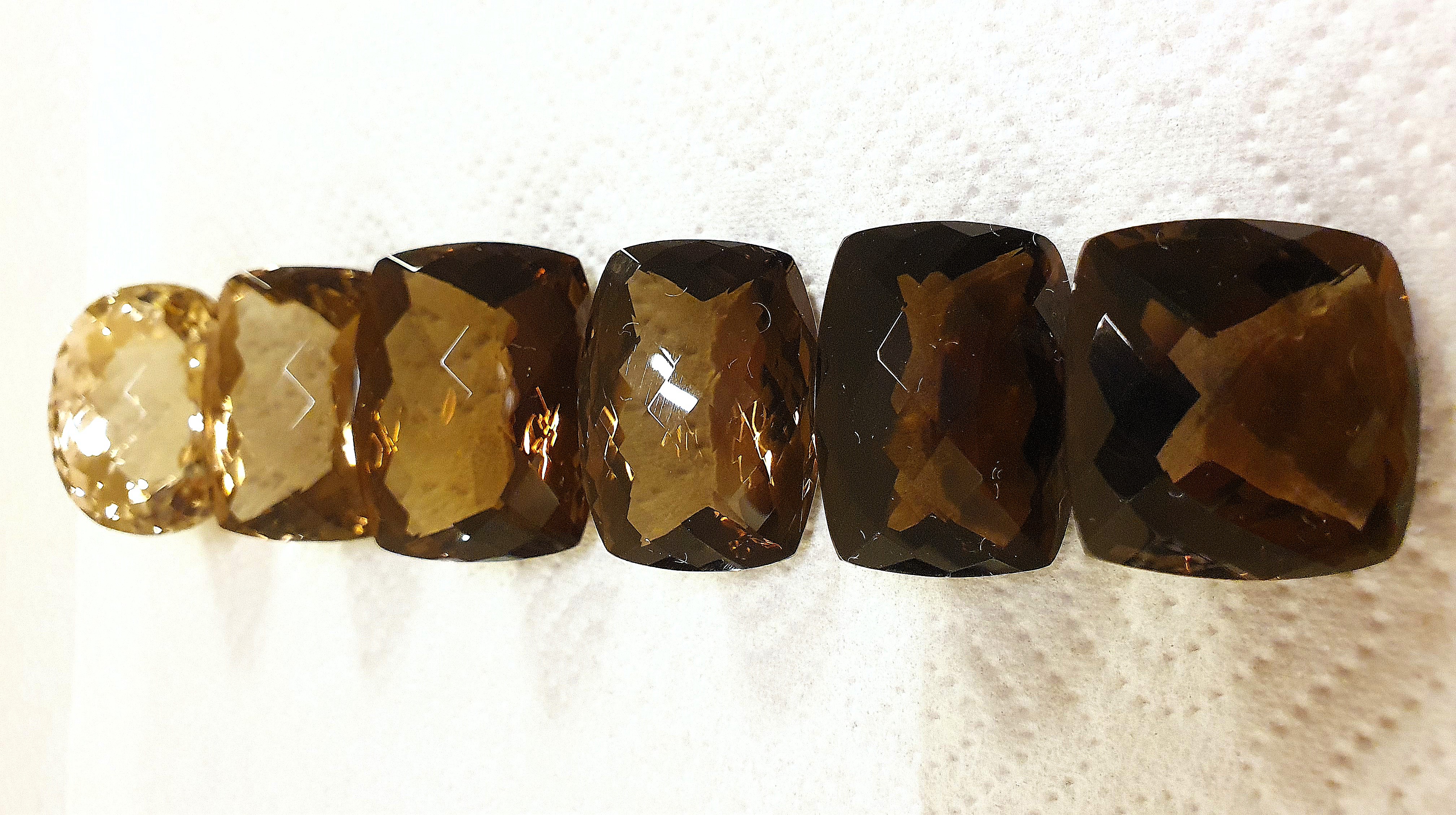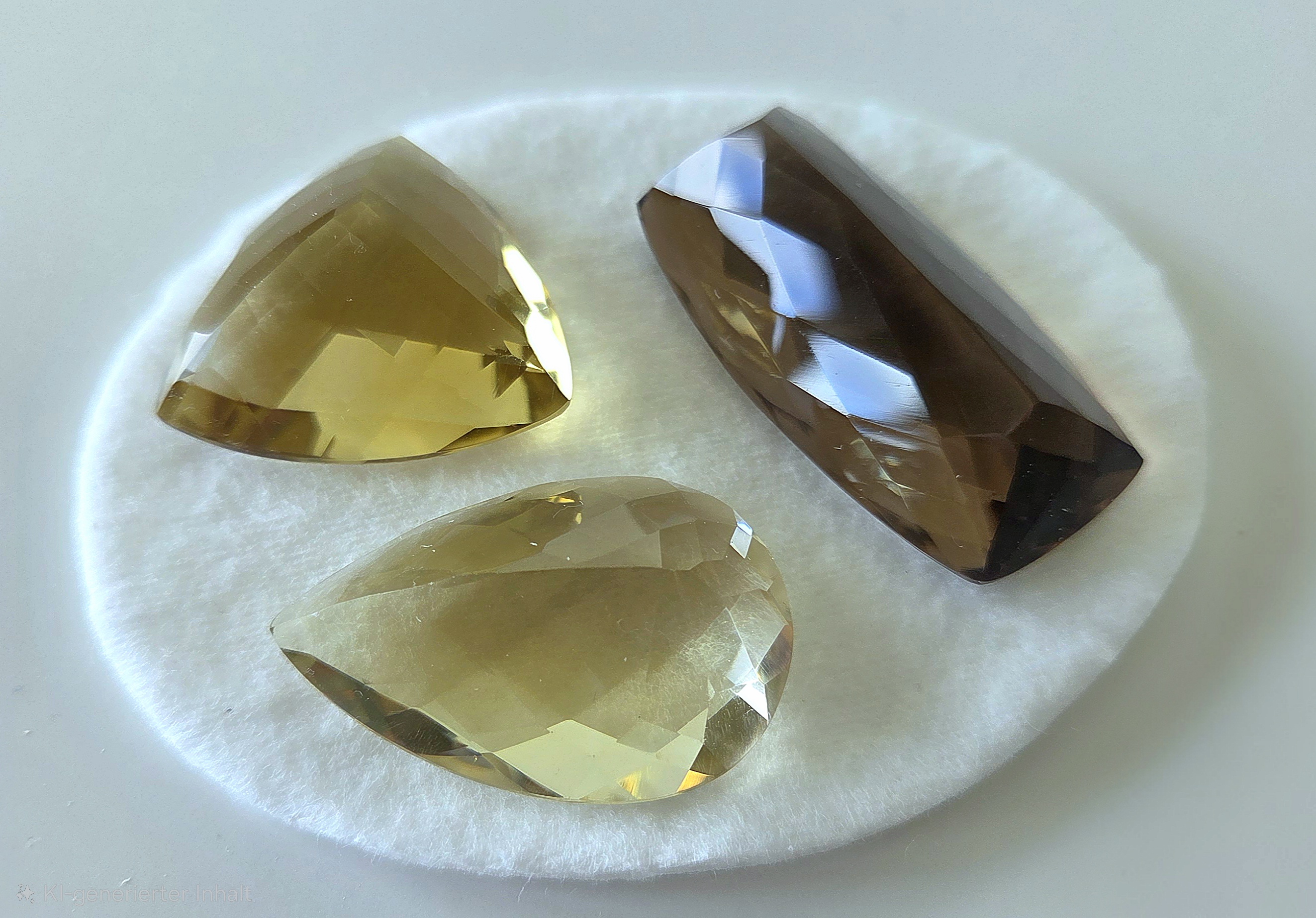 Das erste und zweite Bild zeigen übrigens sehr schön die farblichen Übergänge von einem ganz leicht rauchigen, goldgelben Citrin über helle und dunkle Rauchcitrine bis hin zu dunklen Rauchquarzen. Die Farbursache ist bei allen dieselbe, nur das Verhältnis zwischen Aluminium und Lithium unterscheidet sich. Eisen ist nach dem neusten Stand der Forschung bei Naturcitrin nur wenig oder gar nicht beteiligt.