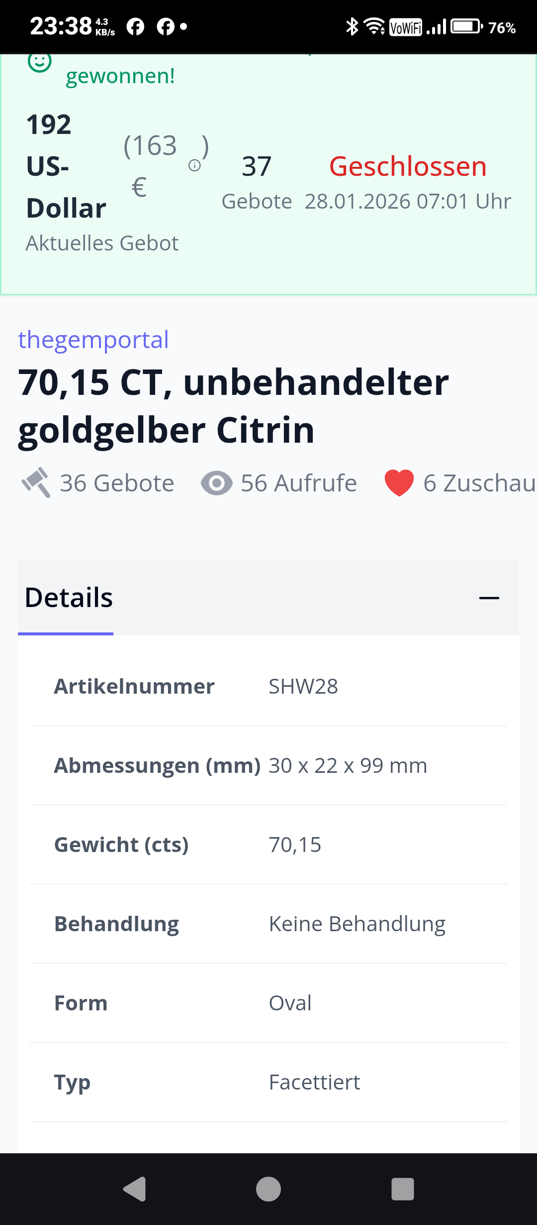 Wäre das wirklich natürlicher, unbehandelter Citrin, würdest du ihn bestimmt nicht irgendwo in Thailand für etwas Kleingeld ersteigern - er kostete um die 1'000 Euro in dieser Grösse. Ich kaufe seit 20 Jahren alle paar Jahre einen grossen, unbehandelten Citrin bei einem Händler, dem ich vertraue und der seine Minen in Brasilien persönlich kennt - der Markt für unbehandelte Citrine ist quasi nicht existent. Der Grund dafür: