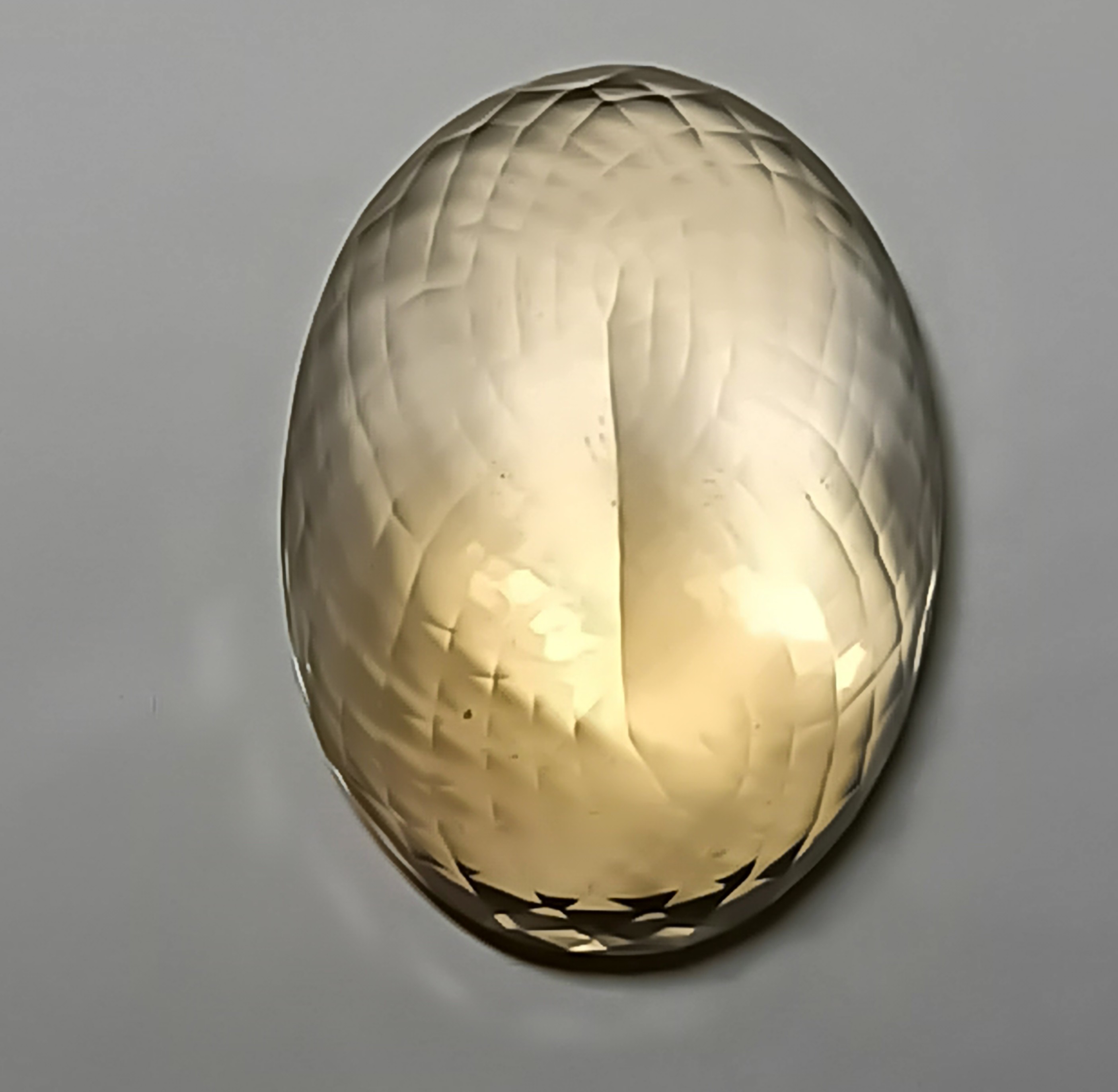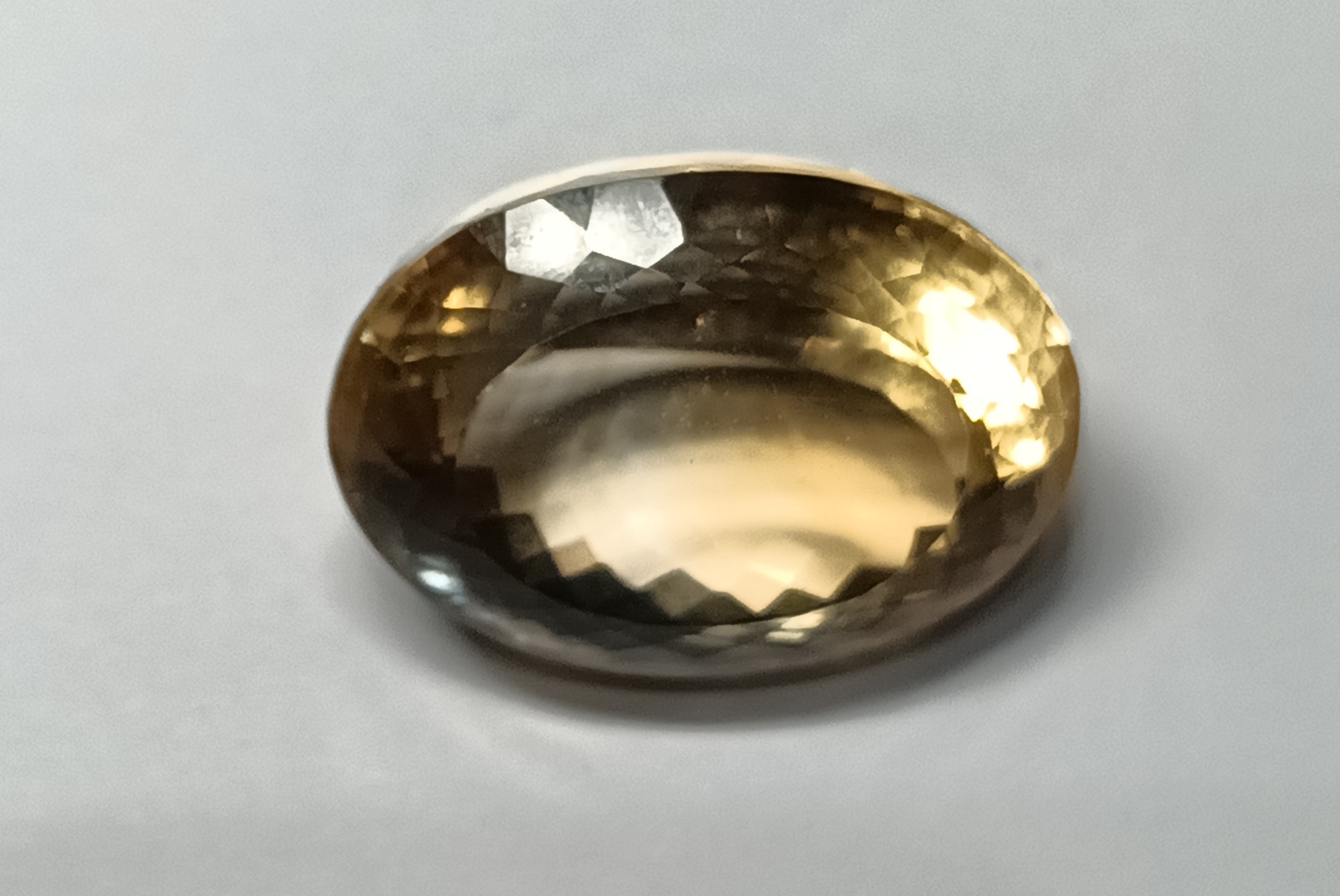 Zum Citrin: Man erkennt sehr schön eine Farbzonierung zwischen einem goldgelben Bereich und einem sehr hellen, klaren Abschnitt. Das weist mit sehr hoher Wahrscheinlichkeit auf einen behandelten Stein hin. Natürliche Citrine zeigen eine gleichmäßige Farbverteilung. Das unterscheidet sie deutlich von Amethysten, bei denen violette und sehr helle, fast weiße Zonen durchaus nebeneinander auftreten können.