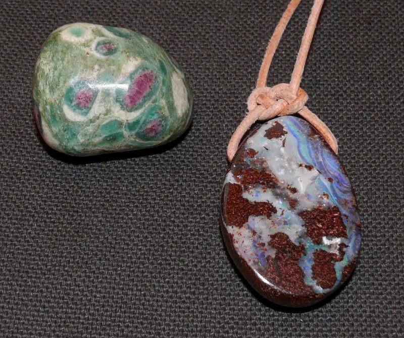 Bei mir sind es heute mal zur Abwechslung vom Nephrit Donut ein Boulder-Opal und Rubin-Fuchsit-Disthen ... Bunt und munter.