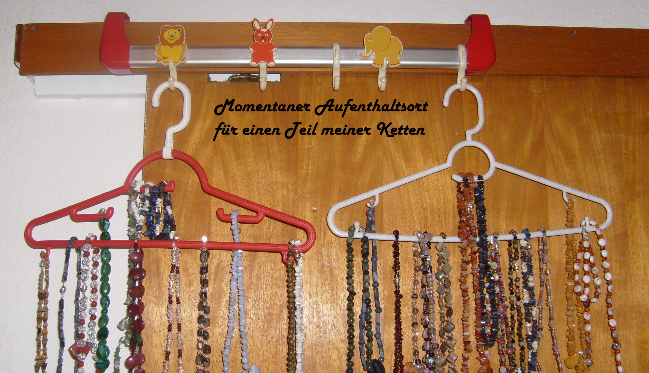 Liebes Blümchen, sehr schöne Idee ´+##+#´´+ ´+##+#´´+ ich habe meine Anhänger und Ketten an Haken in meiner Vitrine aufgehängt und einen Teil der Ketten über den Rand einer Glasvase die oben Spitzen wie eine Königskrone hat aufgehängt, stell mal Bilder mit ein, ok.