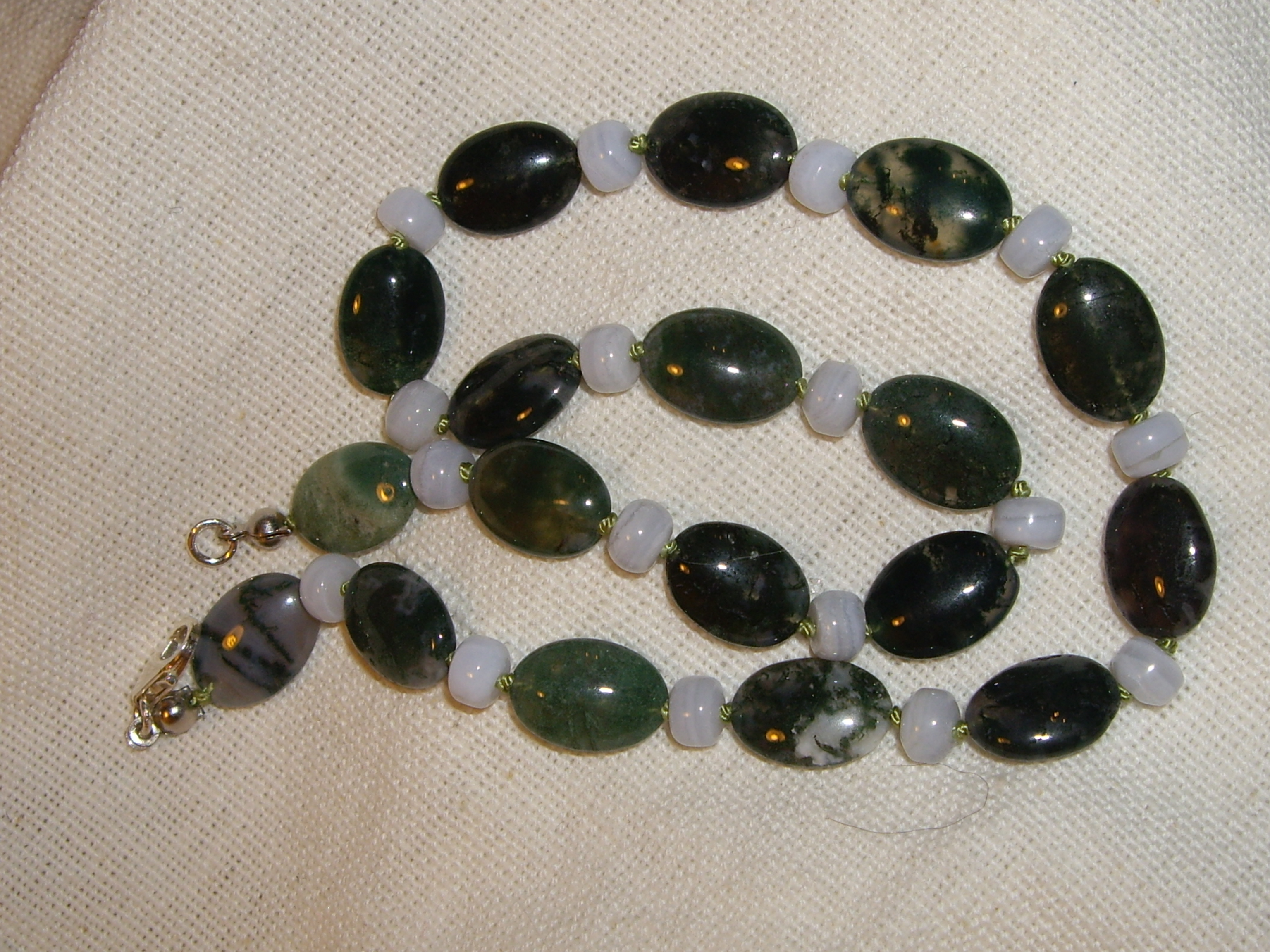 Heute trage ich eine Kette mit Moosachat und blauem gebändertem Chalcedon. Hatte heute morgen leichtes Kratzen im Hals, fror und die Nase lief. Von meinen Erkältungsketten wollte es heute diese sein.