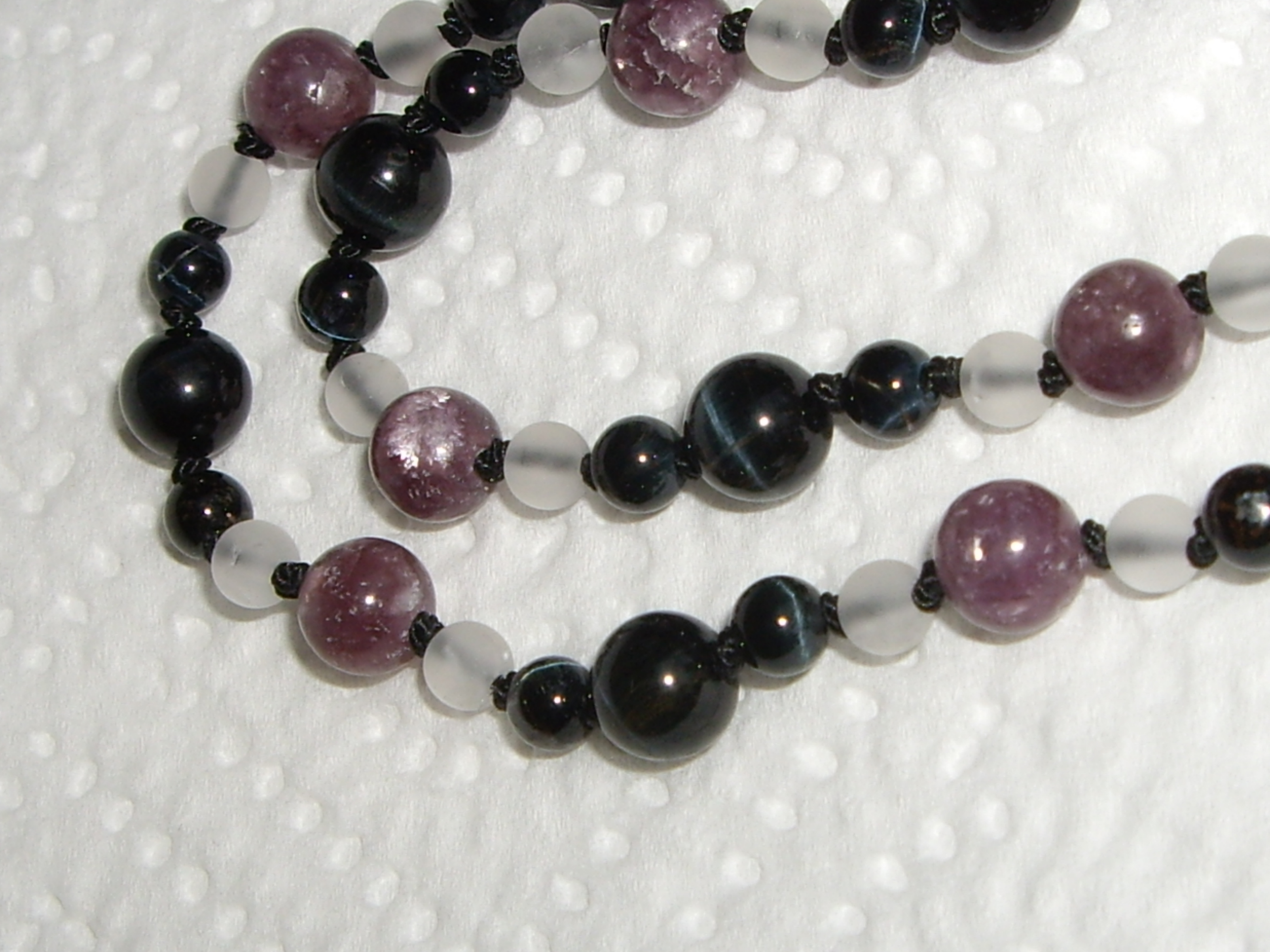 Die zweite ist mit 4 und 6 mm Falkenauge Kugeln, 4 mm Bergkristallkugeln matt und 6 mm Lepidolith-Kugeln. sie wirkt eher leicht und weich.