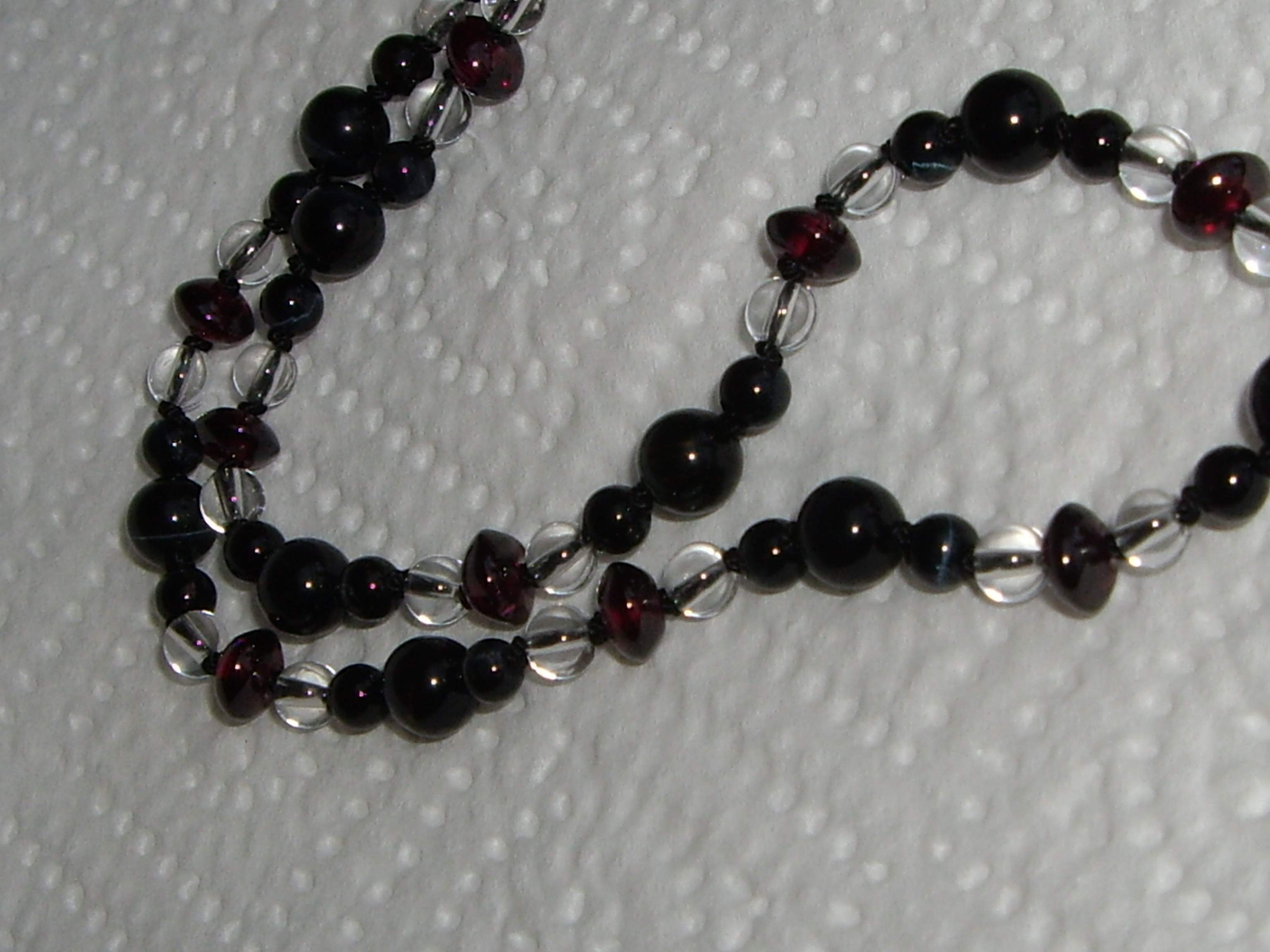 Die erste ist mit 4 und 6 mm Falkenauge Kugeln, 4 mm Bergkristallkugeln klar und ca. 6 mm Granat-Linsen. Sie wirkt eher kraftvoll und stark.