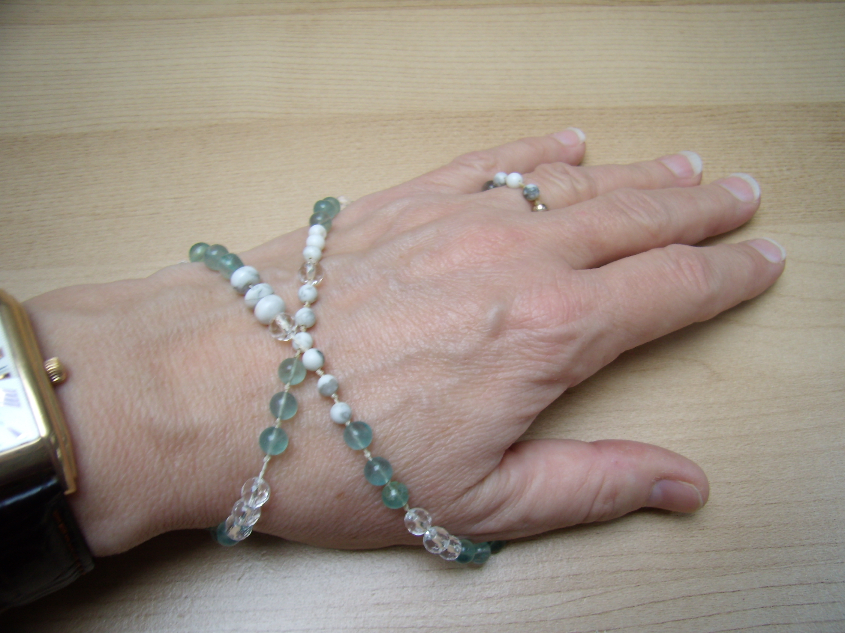 Ich habe ja immer das Problem mit dem Befestigen der Steine, die ich nicht als Kette oder Anhänger um den Hals tragen kann, weil ich keinen Kleber von Pflastern usw. vertrage. Beim rumspielen mit einer ziemlich langen Halskette bin ich jetzt auf eine Lösung für mein Daumengelenk (Arthrose) gestoßen und trage seit ein paar Nächten meine Apatit-Magnesit-Bergi-Kette in dieser Form. Die Wirkung ist so toll, daß ich die Kette jetzt auch schon tagsüber immer griffbereit habe und sie bei jeder günstigen Gelegenheit um mein Daumengelenk wickele.