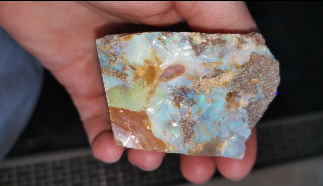 Der Rohstein ist nur etwas kantig zurechtgeschliffen und die Opalsignatur wurde zum Glänzen gebracht: