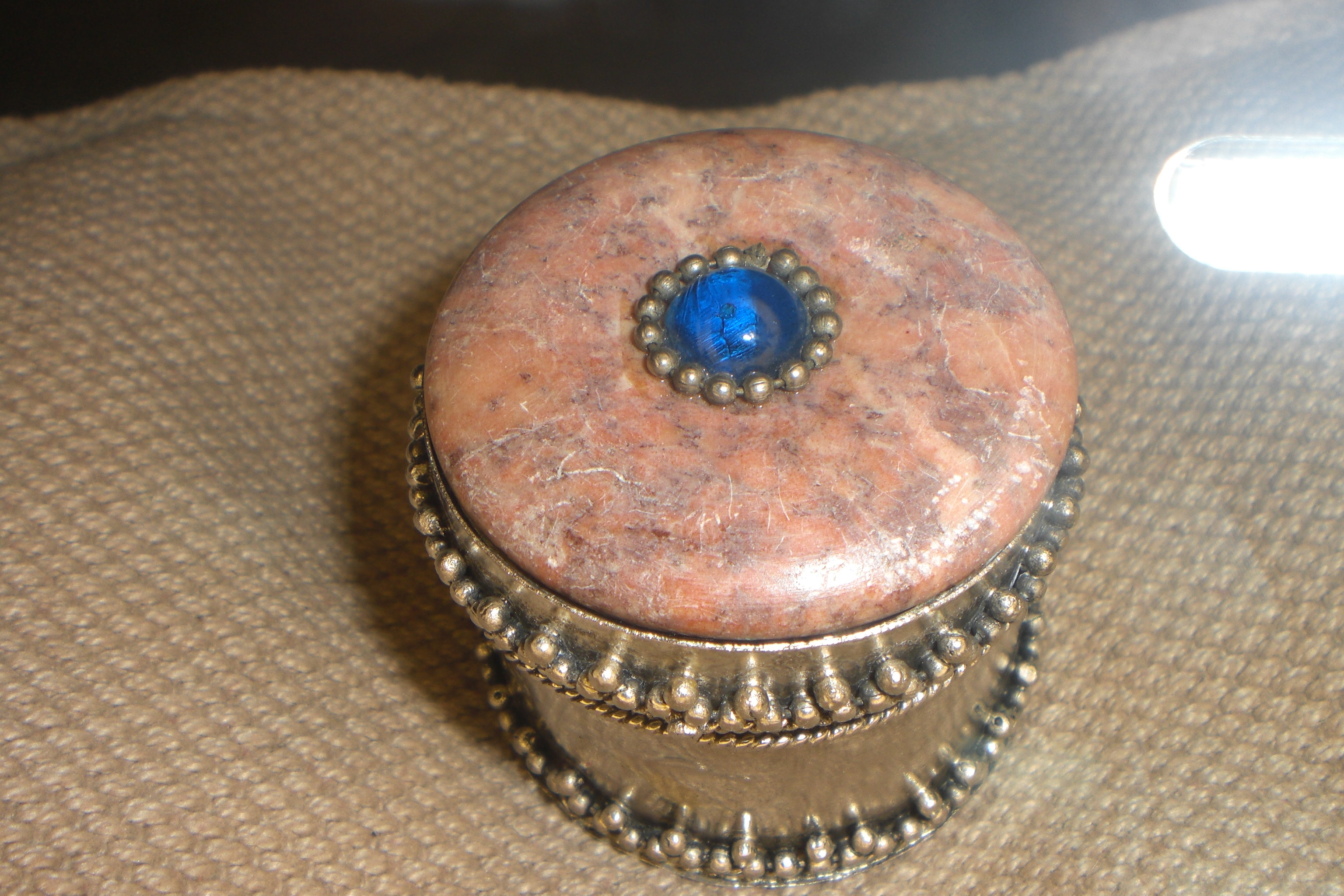 Marmor vielleicht, oder das, was immer als Onyx angeboten wird, in Wirklichkeit aber Aragonit-Calcit ist. Der blaue Stein in der Mitte sieht für mich wie Glas aus.