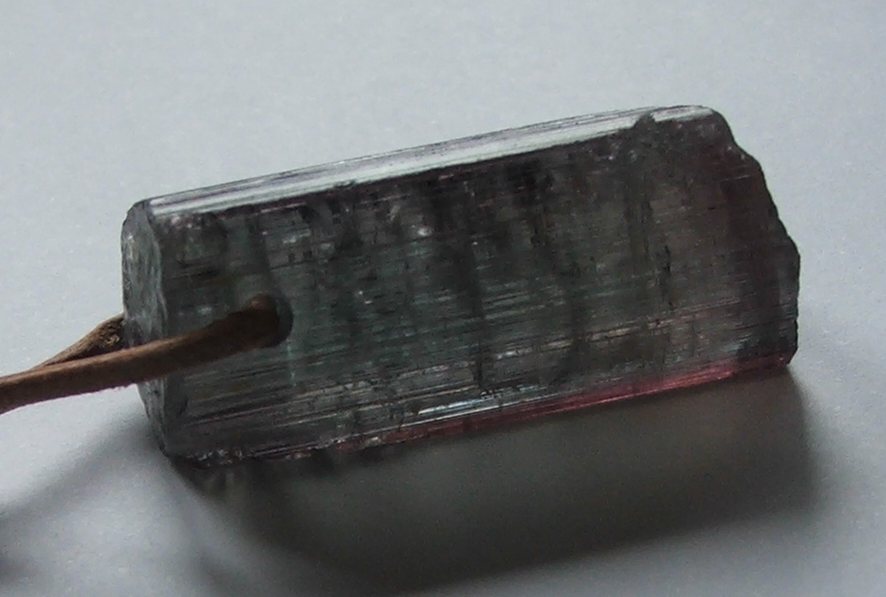hier möchte ich Euch meinen Turmalin zeigen. Er wirkt grau-blau-rosa und recht dunkel. Wenn man Ihn ins Licht hält ist er sehr transparent und hell...