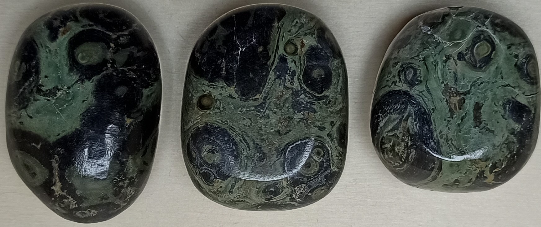 Dünnschliff- und Röntgendiffraktionsanalysen des EPI-Instituts haben ergeben, dass es sich keinesfalls um eine Art von Jaspis, sondern um ein vulkanisches Gestein handelt. In der grünen Grundmasse aus Quarz, Pyroxen (Aegirin), sowie Natron- und Kalifeldspäten sind kreisförmig bis schlierig verteilte schwarze Aggregate aus winzigsten Amphibol- Nädelchen (Riebeckit bis Pargasit) eingebettet.