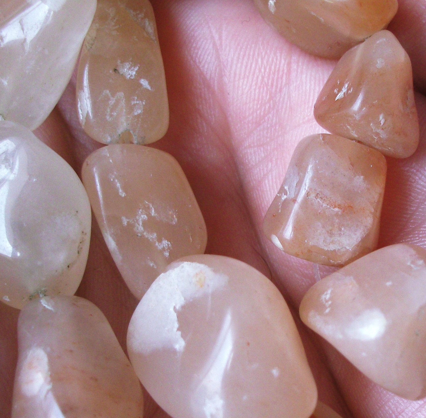 Das ist schln eine eher günstige Sortierung an Steinen, da ist es auch imme oder oft schwieriger zu bestimmen, es könnte ein brauner Mondstein sein der Erste, oder was quarziges.