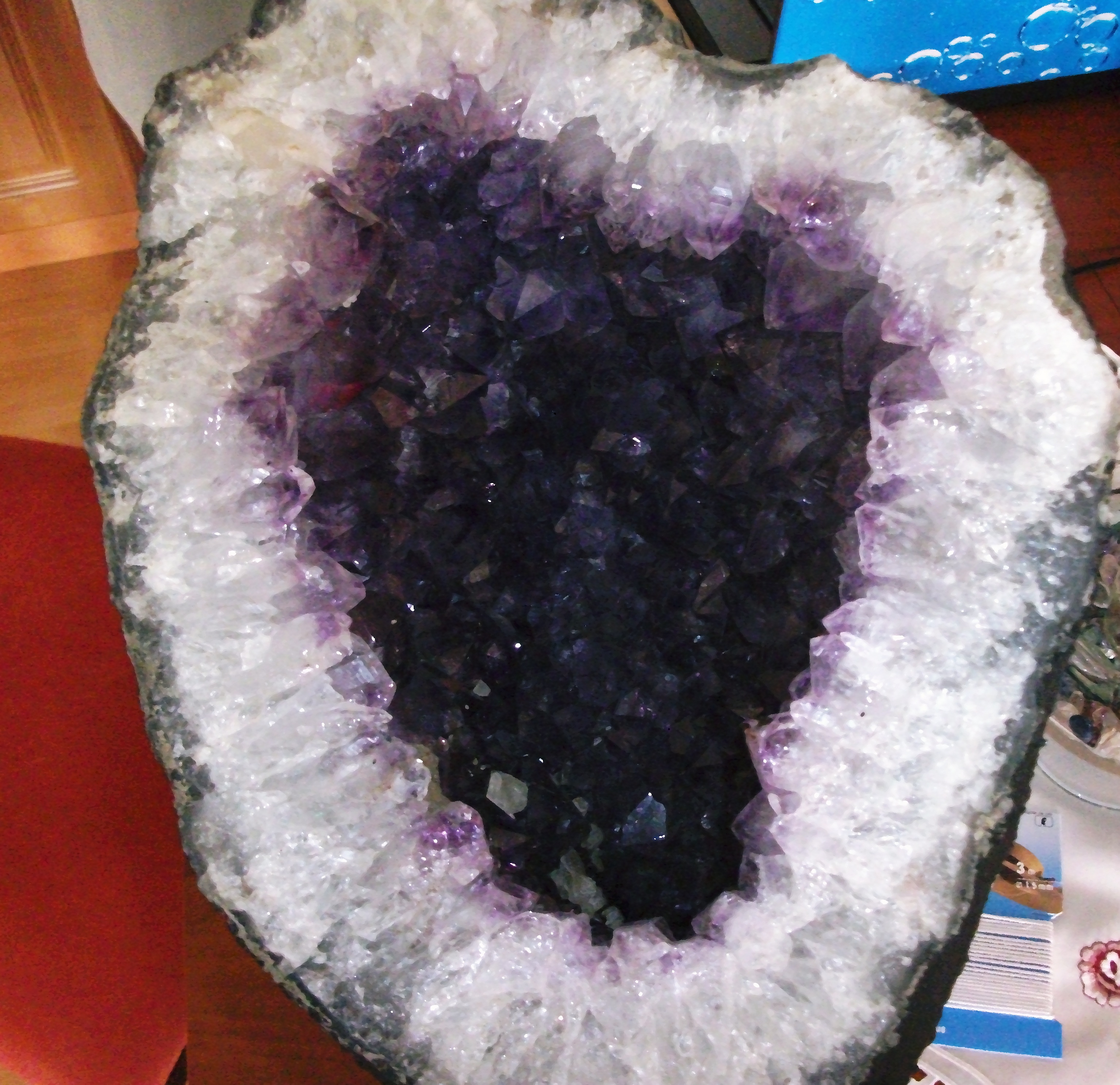 Die große hat ein Gewicht von 15 kg und ganz dunkle große Kristalle und die Kleine wiegt ca.2-3kg und hat fast eine Fliederfarbe.Hoffe sie gefallen euch auch so wie mir.