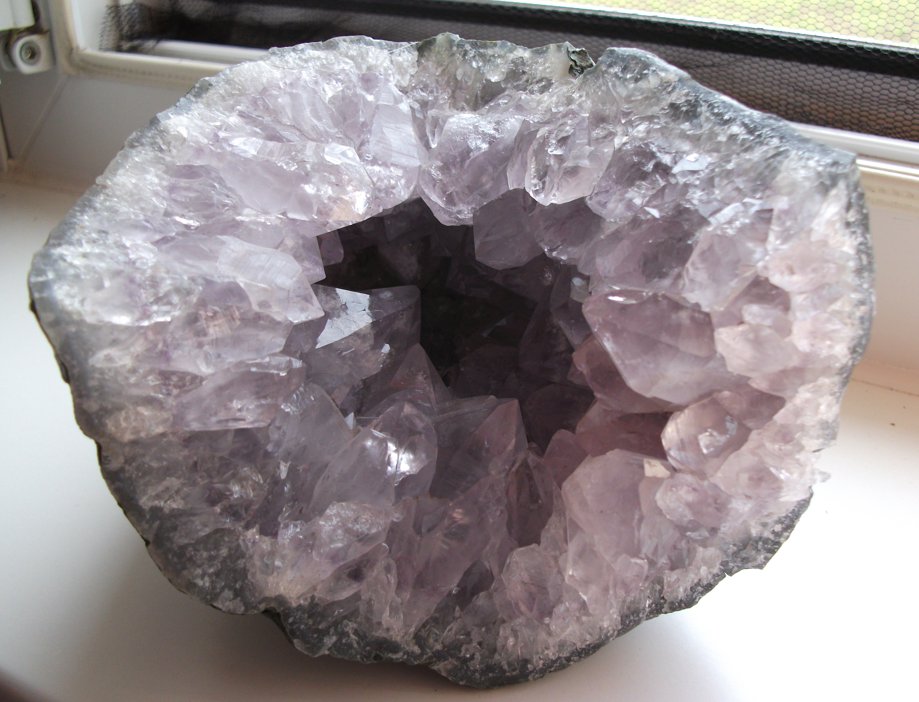 Die große hat ein Gewicht von 15 kg und ganz dunkle große Kristalle und die Kleine wiegt ca.2-3kg und hat fast eine Fliederfarbe.Hoffe sie gefallen euch auch so wie mir.