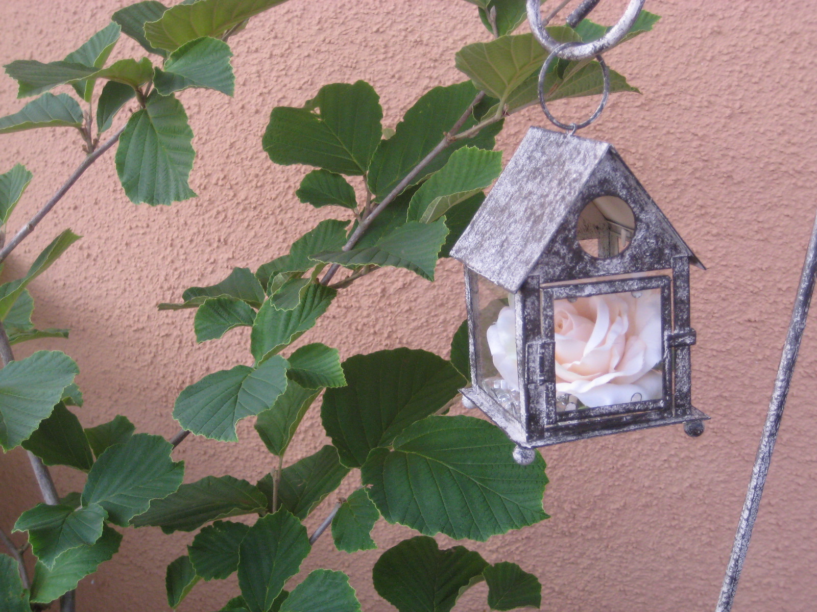 Danach wird die Schale mit dem zugehörigen Deckel verschlossen und an den Ort der Besonnung gestellt. Als Standort habe ich für meine Essenzen das schlichte, weiße Holzgeländer des Südbalkons gewählt – und zwar die Planken, die nach Westen ausgerichtet sind. Dort stehen die Schalen über den gesamten Zeitraum ungestört und sicher (wenn eine 4jährige sehr aktive und wissensdurstige Tochter im Haus lebt, ist das durchaus wichtig) und die Steine können so ungestört ihre Arbeit tun – ihre Information auf das Wasser übertragen. Ich habe den Balkon, seit ich dort Steinessenzen herstelle, noch etwas behaglicher und lebendiger ausgestattet. Zwei Zaubernüsse wohnen jetzt auf dem Balkon, in ihrem Topf je ein großer Rosenquarz und in einem kleinen Metallhäuschen, das auf einem Metallspieß hängt, sind eine Seidenrose mit Mini-Bergkristall-Trommlern.