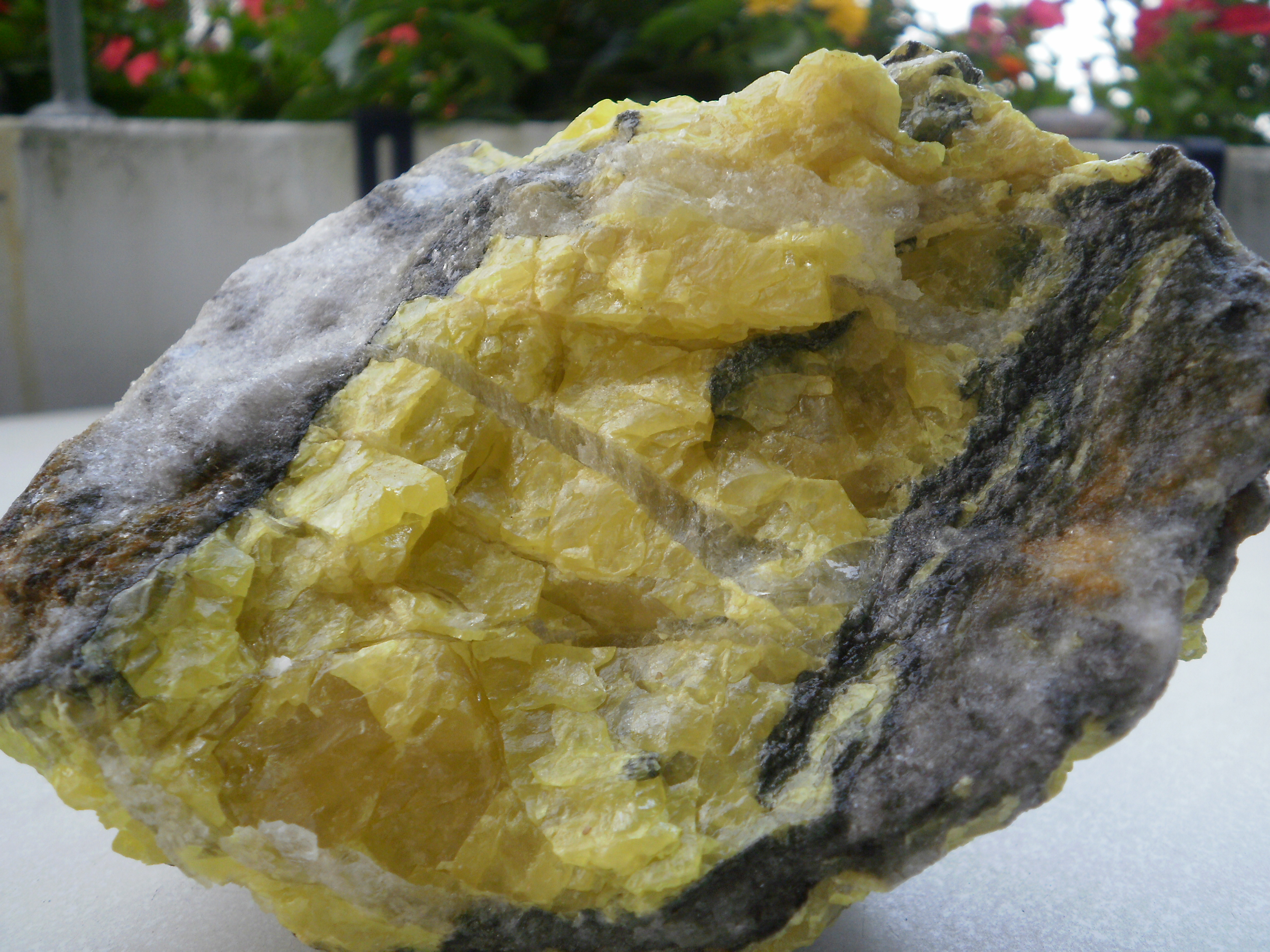 Also Schwefel der kann schon mal auf Gips auf Calcit und auch auf Quarz vorkommen.