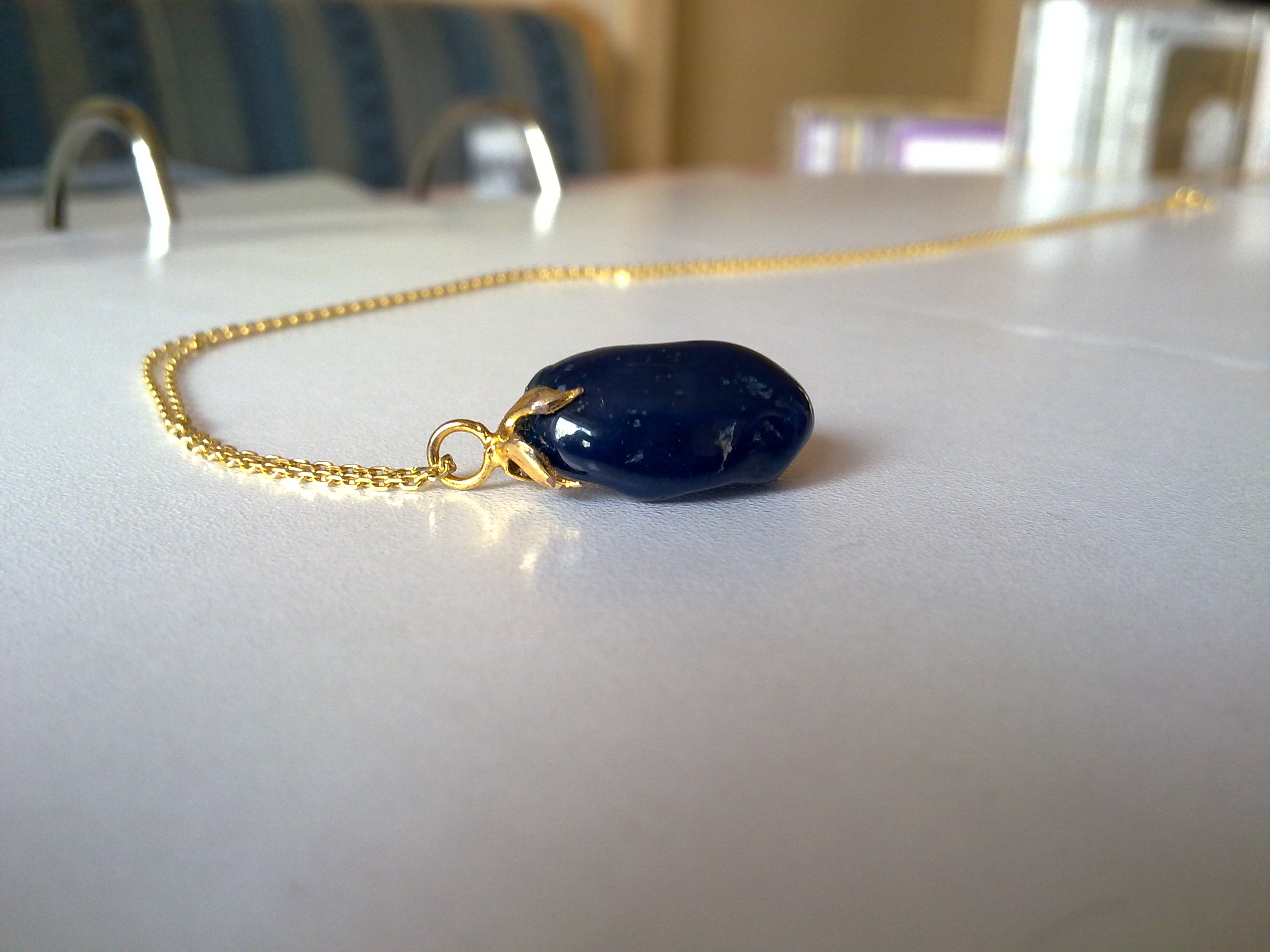 schön, besonders an der Goldkette! Ich denke es ist ein blau gefärbter Achat. Schau doch mal ob er transparent ist, wenn Du ihn gegen eine Lichtquelle hältst, dann ist es (wahrscheinlich) ein Achat. Vielleicht erkennst Du dann auch eine Bänderung...