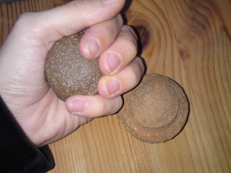 Hab eben mal meine zwei Moquis geschnappt und mal gewogen und gemessen. Sie sind (für meine kleinen Hände) gut Handfüllend, haben einen Durchmesser von fünf Zentimeter (Weibchen) und sechs Zentimeter (Männchen). Das Weibchen wiegt 98g und das Männchen 88g. Das Weibchen ist der Stein mit der glatteren Oberfläche und das Männchen ist der Stein mit dem "Gürtel" um :D