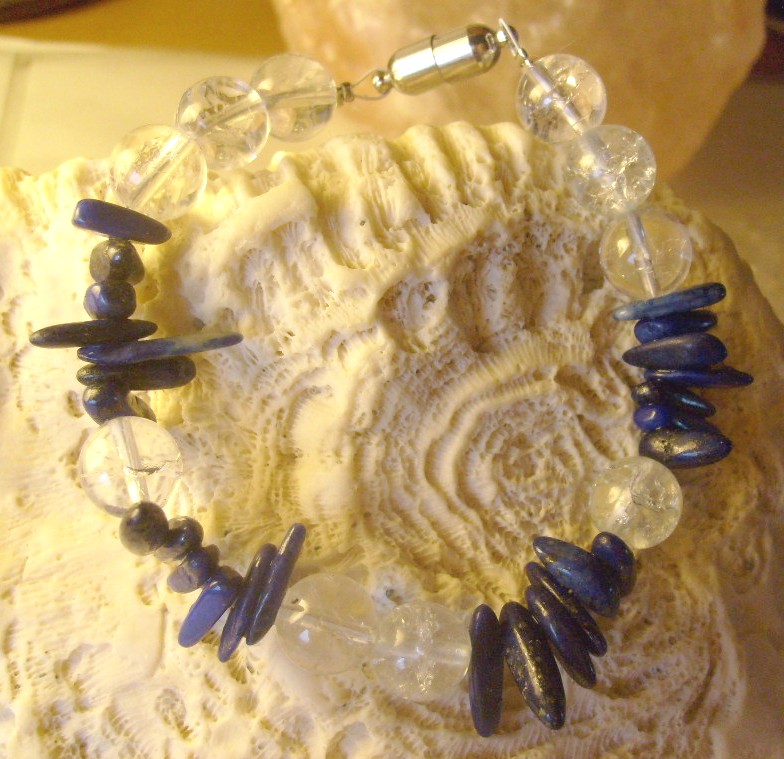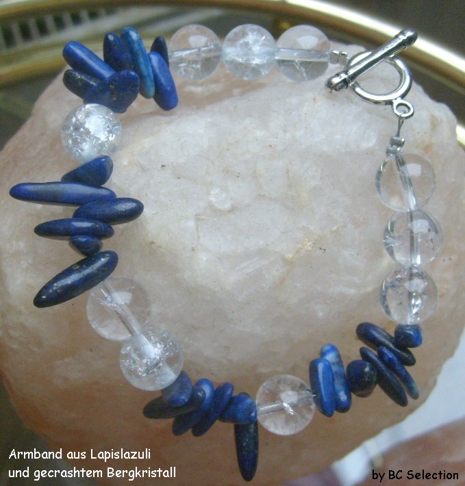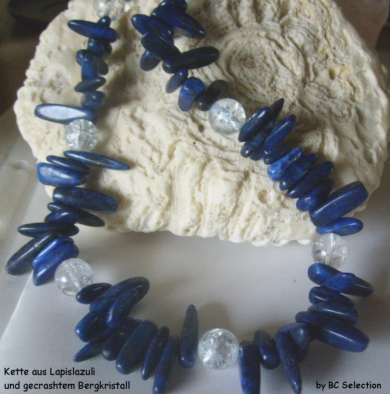 vorgestern hab ich diese Lapiskette aus grossen Splittern und gecrashtem Bergkristall gemacht, dazu das passende Armband.