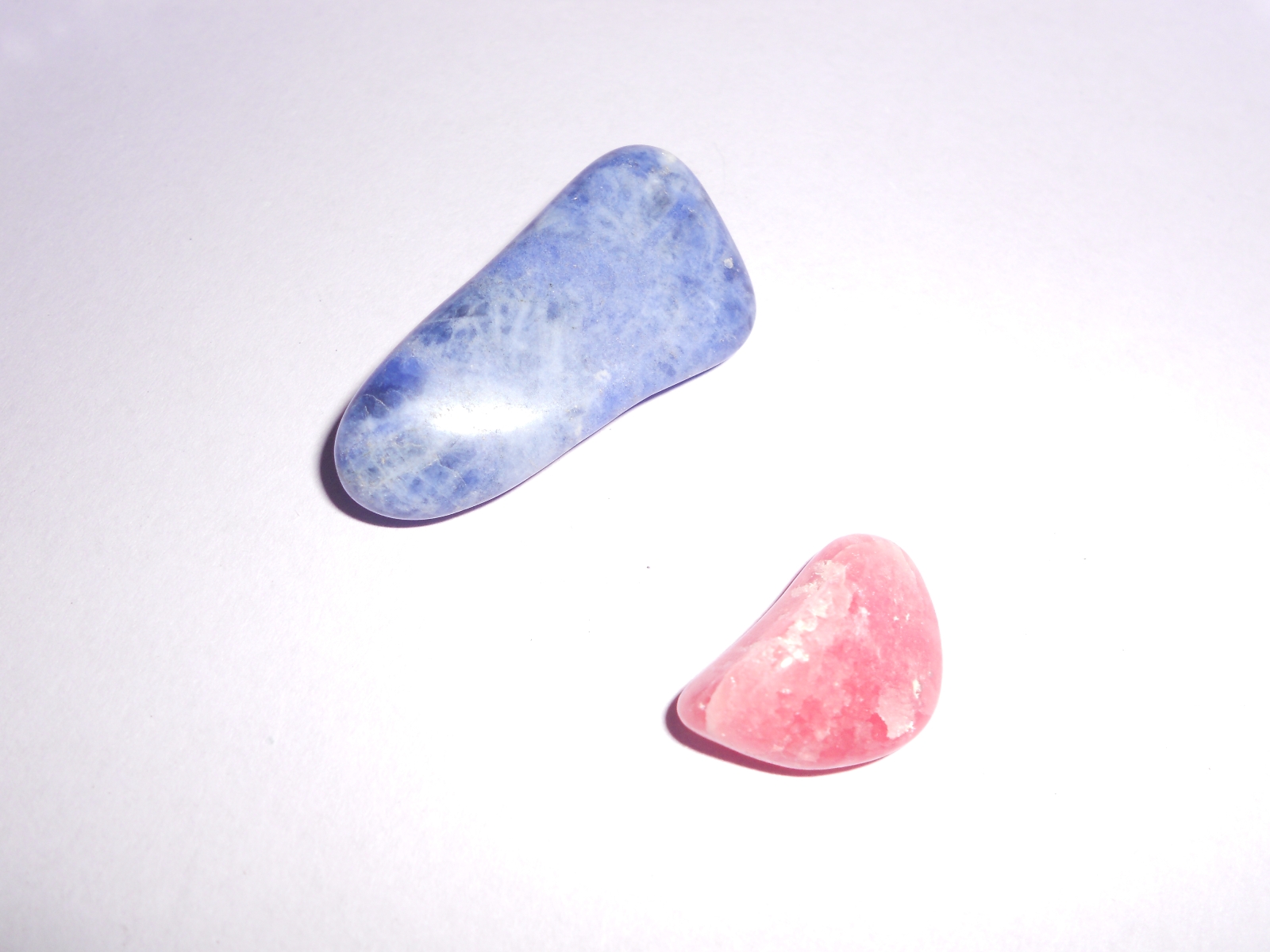 ) und ich kann nur tippen , entweder Blauquarz oder Sodalit, der rosafarbene ist Rosenquarz. Oh, ich sehe gerade, dadrunter hast du die selben Steine nochmal, da könnte der blaue auch ein Dumortierit sein....