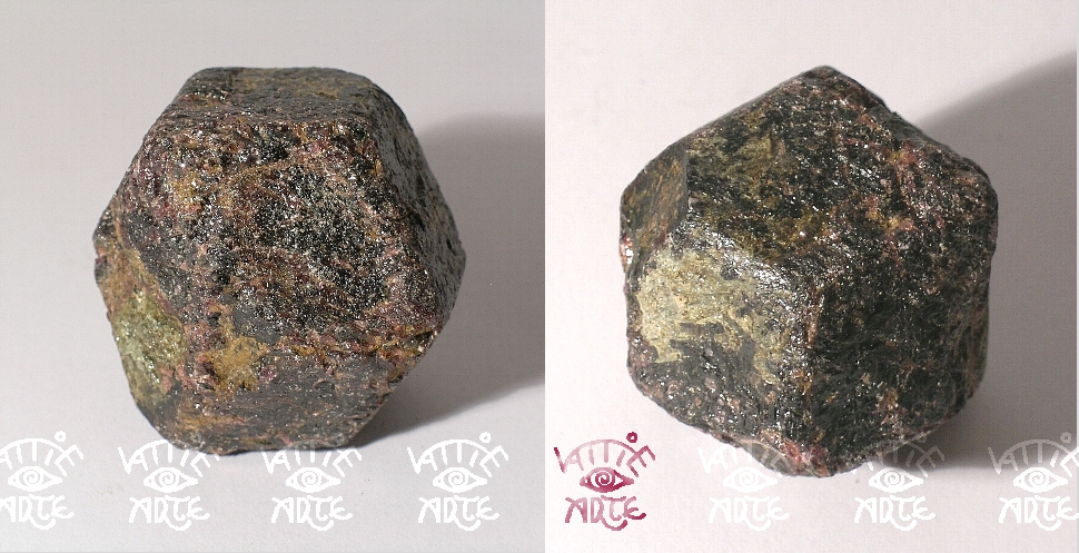 Dieser Granat ist von Spitze zu Spitze ca. 40mm und von Fäche zu Fläche ca. 50mm groß. Er wiegt ca. 165g.