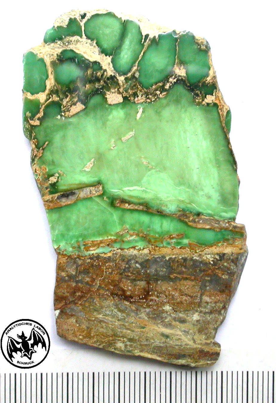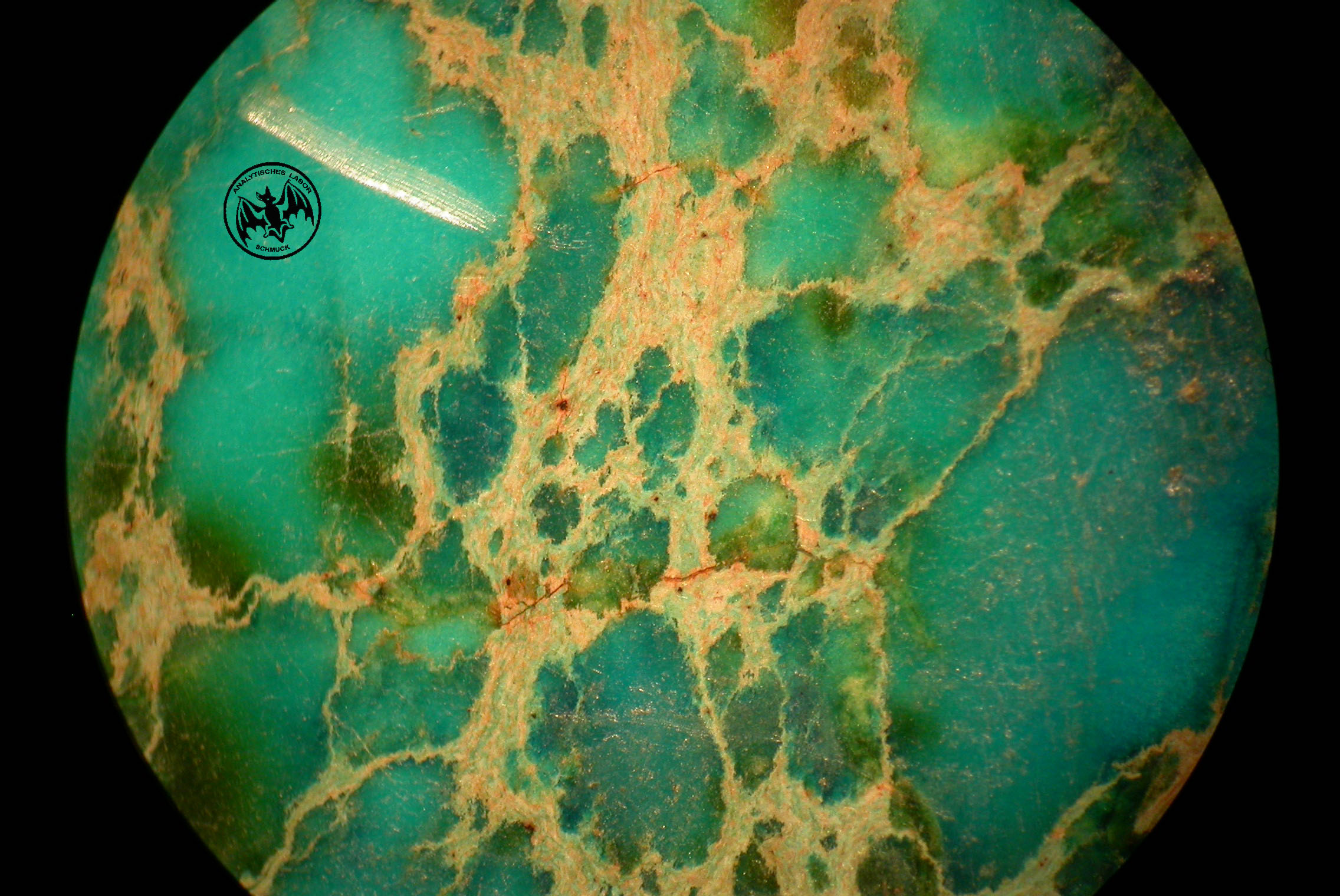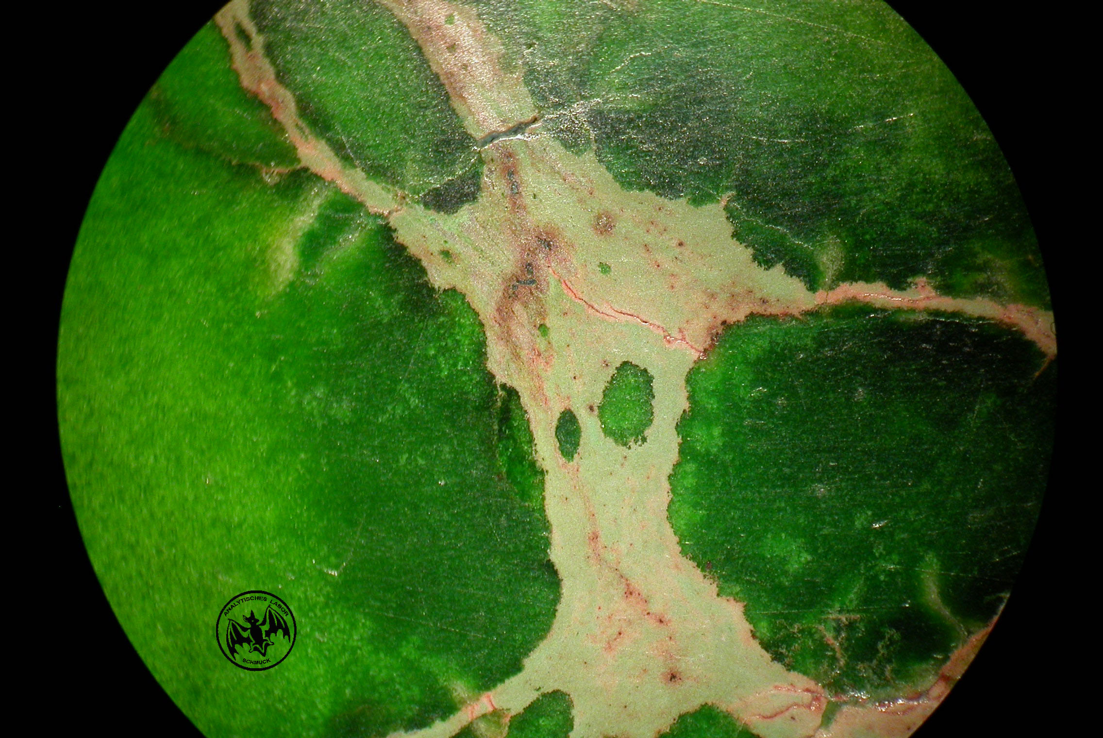 Weiße Aderungen und mit Variscit gefüllte Risse fehlen.