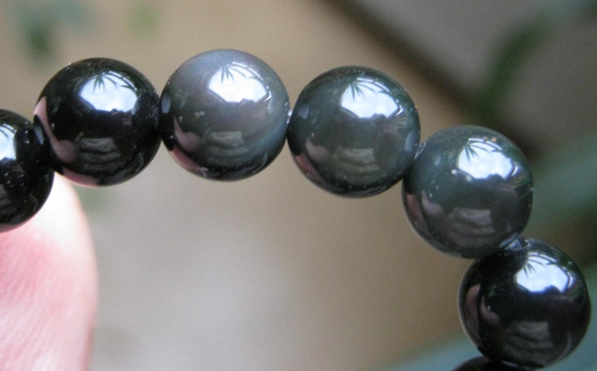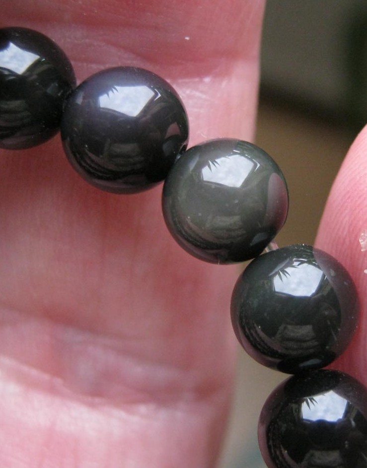 Dieser Strang ist mit Sicherheit Regenbogenobsidian auch wenn es nicht so leicht zu erkennen ist.