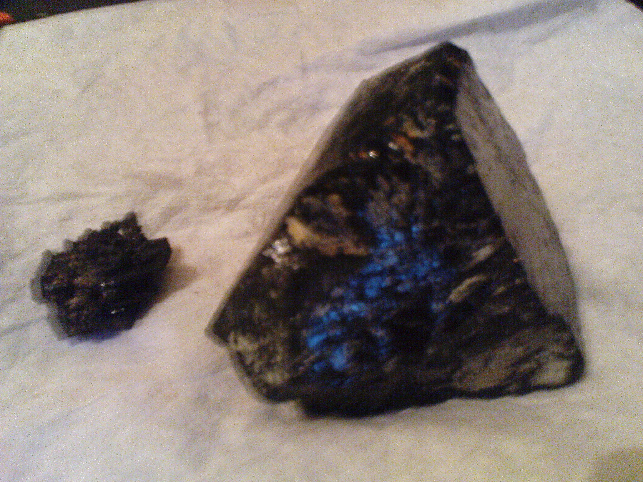 Hallo, bei uns schließt ein Steinladen und ich hab mir dort ein paar gekauft. Nun habe ich die Vermutung als Anfänger das hier Steine bei sind die gefälscht wurden. Es sind unter anderem 2 schwarze Turmalinsteine. Bei einem blättert das schwarze ab und bei dem anderen welcher in einer chinesischen Zeitung gewickelt war den ich so im Internet unter schwarzer Tumalin so gut wie garnicht finde.