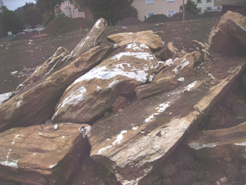erst heute ist an der Baustelle wieder was passiert, allerdings hat man nur grossflächiger das Erdreich abgeschoben, ist etwas tiefer gegangen ( wo es möglich war ) , der Bagger ist weg und etliche grössere Brocken, so um 1 meter, wurden auf einem Haufen gesammelt.