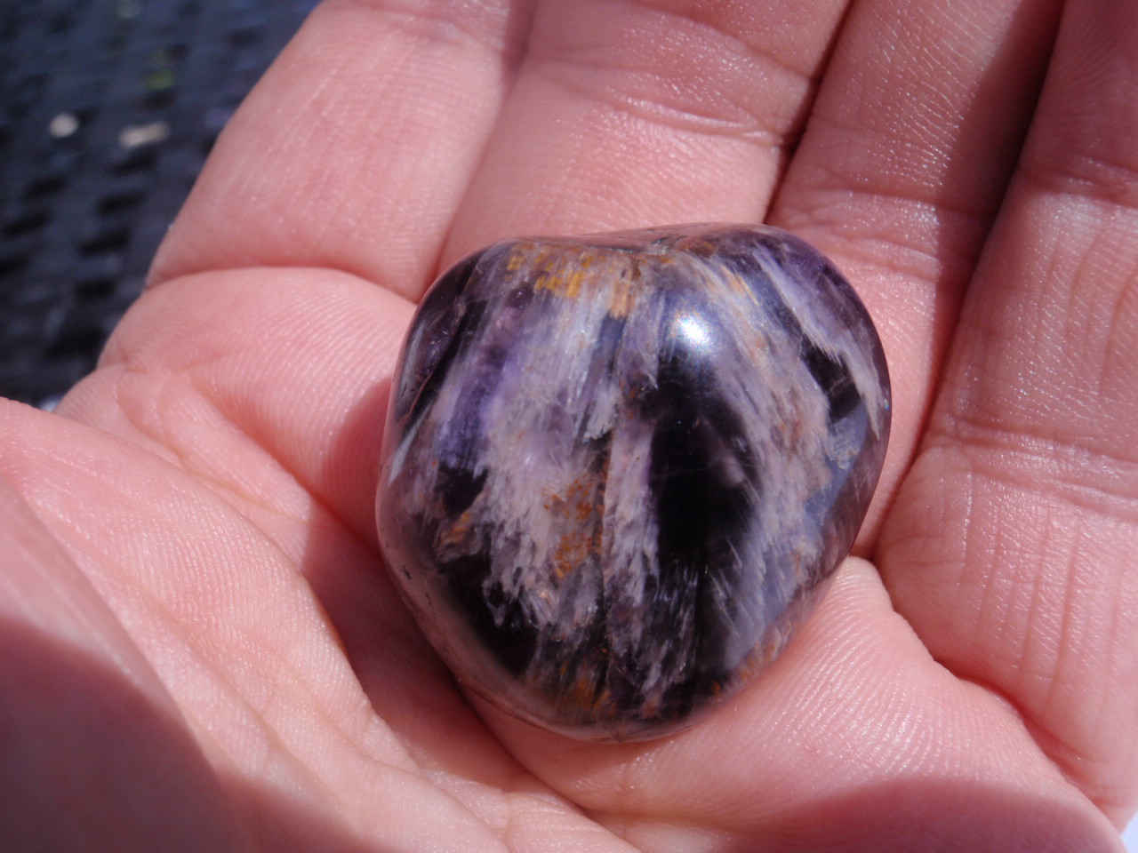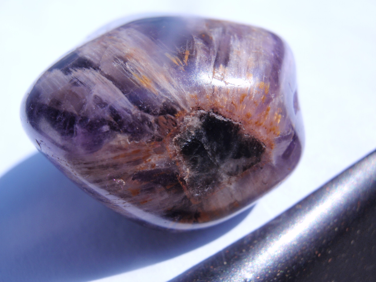Der Amethyst hat an der oberen Seite kleine hellbraune Bürstchen, die in der Sonne golden schimmern...