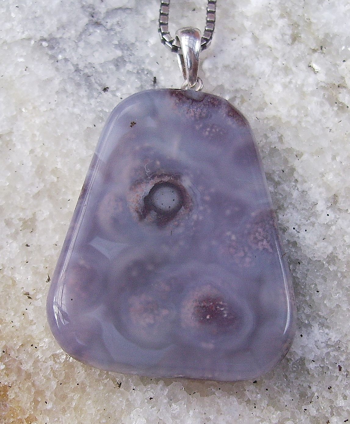 Das Material auf der "Rückseite" (die ich für mich direkt als die eigentliche Vorderseite des Anhängers tragen würde) erinnert mich stark an meinen Chalcedon-Lavendelquarz, der richtig toll für Unternehmungen aller Art ist, weil er auch dem schnödesten Behördengang etwas abenteuerliches verleiht...