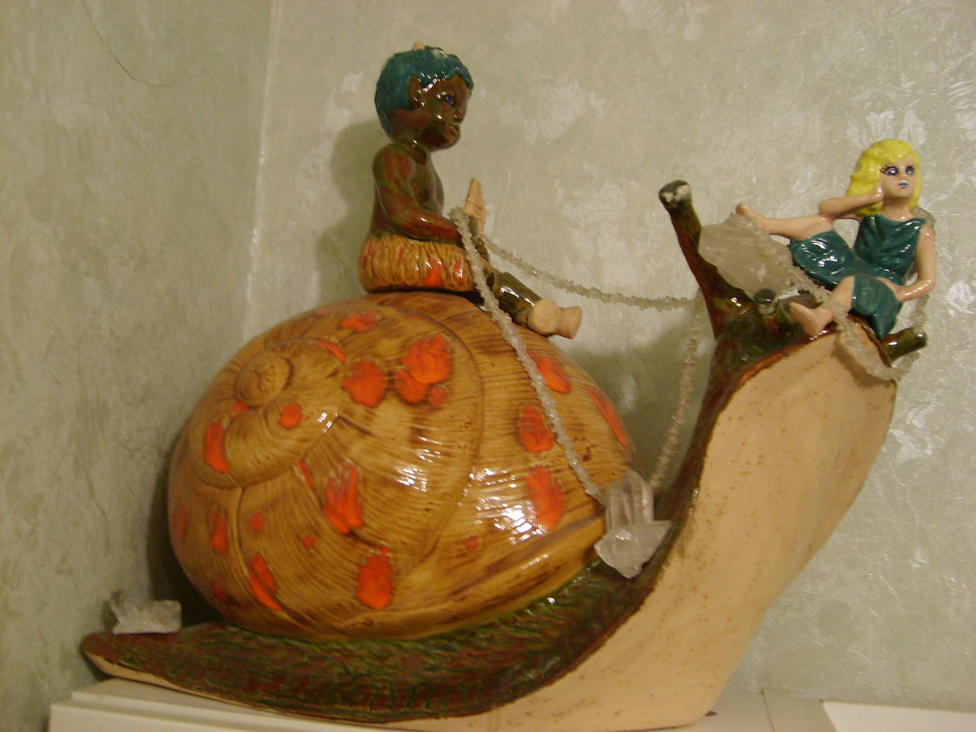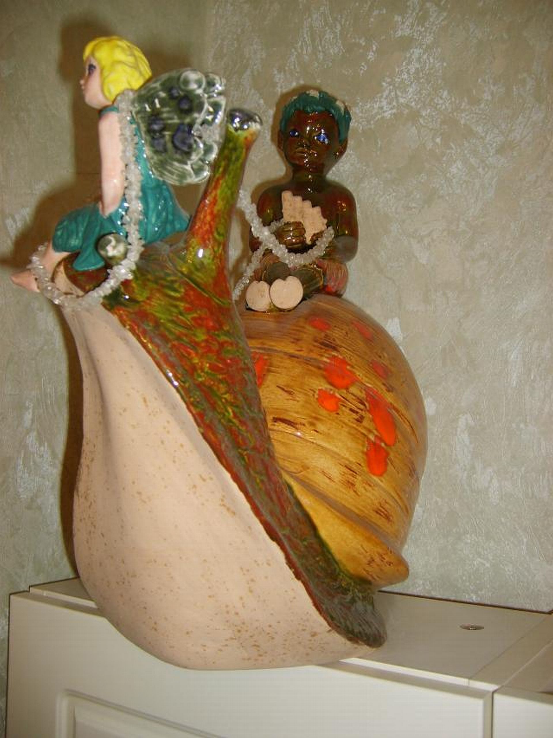 Den Pan habe ich selbst hergestellt, Gießkeramikform und dann gebrannt und mit Glasur bemalt, habe in auch noch auf einer Schnecke verarbeitet mit Elfe