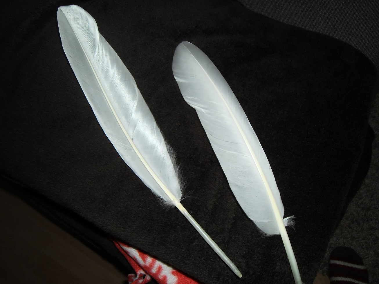 Die Federn sind relativ gebogen und deshalb hab ich die gerade Seite zur Veranschaulichung gewählt, da die Schafte auf der Pappe besser draufliegen.