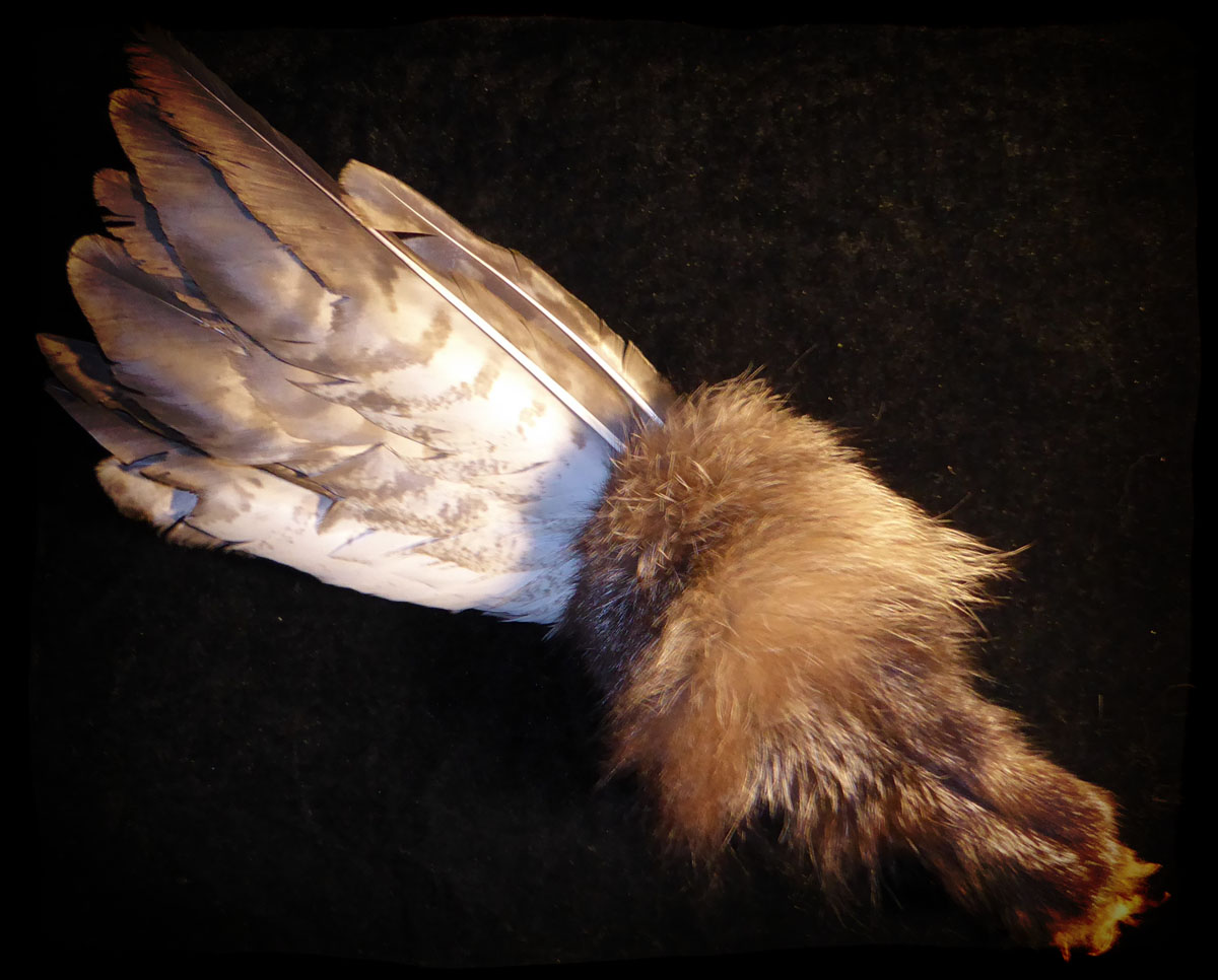 also noch mal hier der verarbeitete Flügel aus dem Urlaub, angehängt ist ein kleiner Hühnergott und ein ausgehöhlter Schwamm oder Seeigel-tentakel: