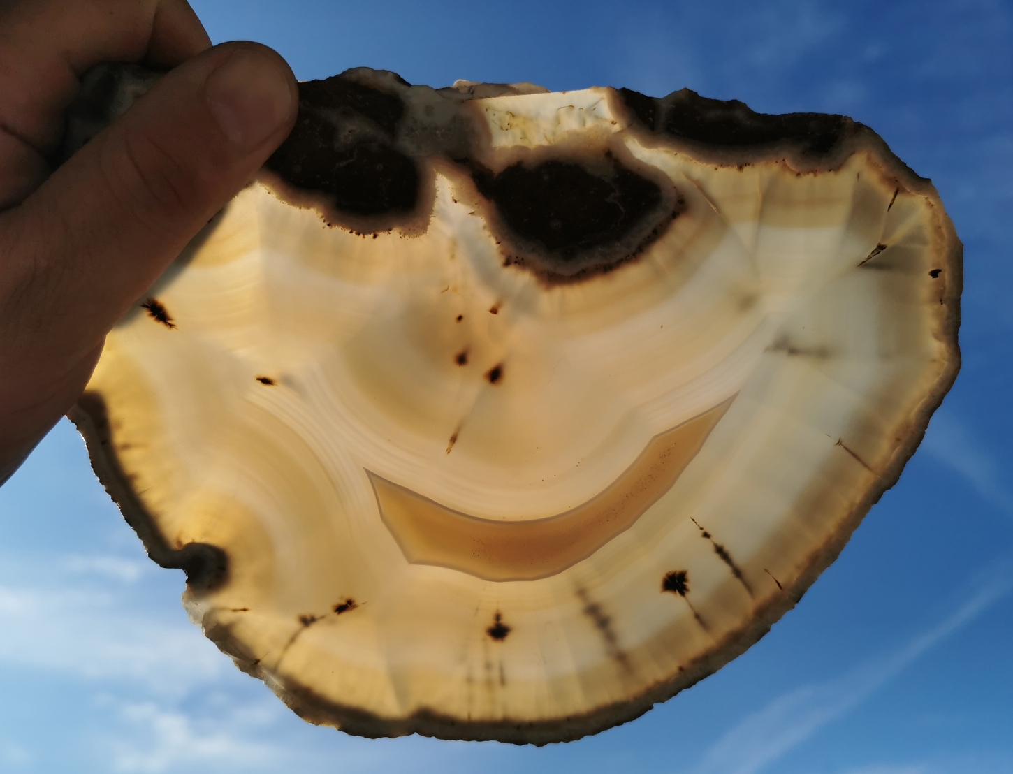 Haha, ich habe das Gesicht anders gedeutet, ähnlich wie bei dem Achat vom Stein-Ei. Ich habe da auch so einen lächelnden breiten Mund gesehen und die Augen, naja, die waren halt nicht ganz so deutlich.