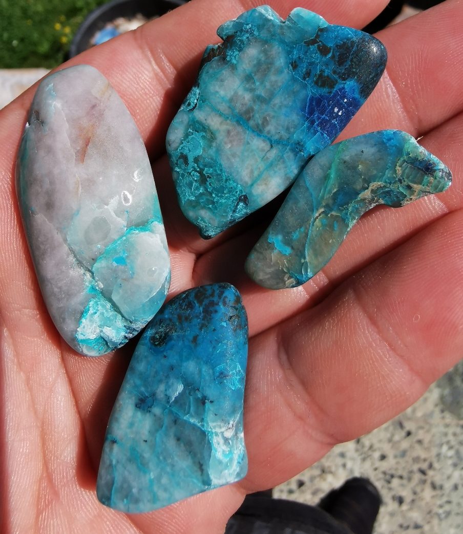 Das ist so ein Mix aus Shattuckit, Chrysokoll, Quarz und teilweise noch ganz viel anderem.Deine Steine sind toll, besonders die hellblauen. Was ist das genau? Tatsächlich Chrysokoll? SIeht mir schon arg hellblau aus..
