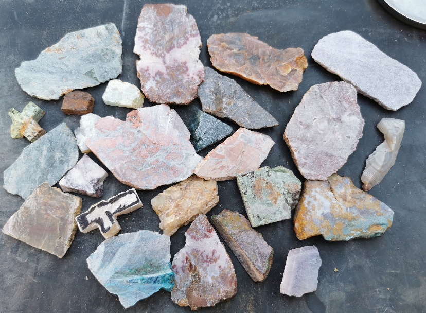 Habe anfangs nur Steinsplitter genommen, um so viele Arten wie möglich auf einmal zu testen. Manche Steine haben auch in sich unterschiedliche Härten, weshalb ich von jedem immer mehrere Stücke aus unterschiedlichen Bereichen vom Rohstein genommen hatte.