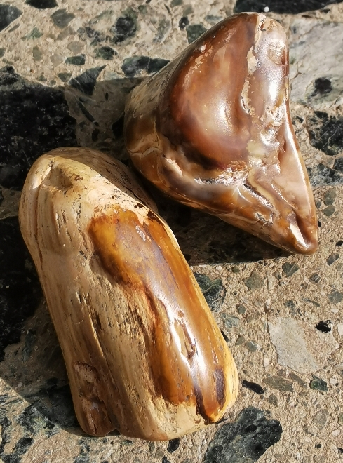 Quarze allgemein lassen sich super polieren. Tigerauge ebenfalls (eigentlich kein Wunder, ist ja ebenfalls Quarz). Versteinertes Holz funktioniert nur an den dunklen Stellen, da der Stein dort sehr hart ist. Je heller die versteinerung, desto weicher der Stein und so weniger polierfähig. Achate sind ja bekanntermaßen die Lieblings-Steine der Trommler und das kann ich jetzt durchaus verstehen. Die Ergebnisse sind wunderschön.