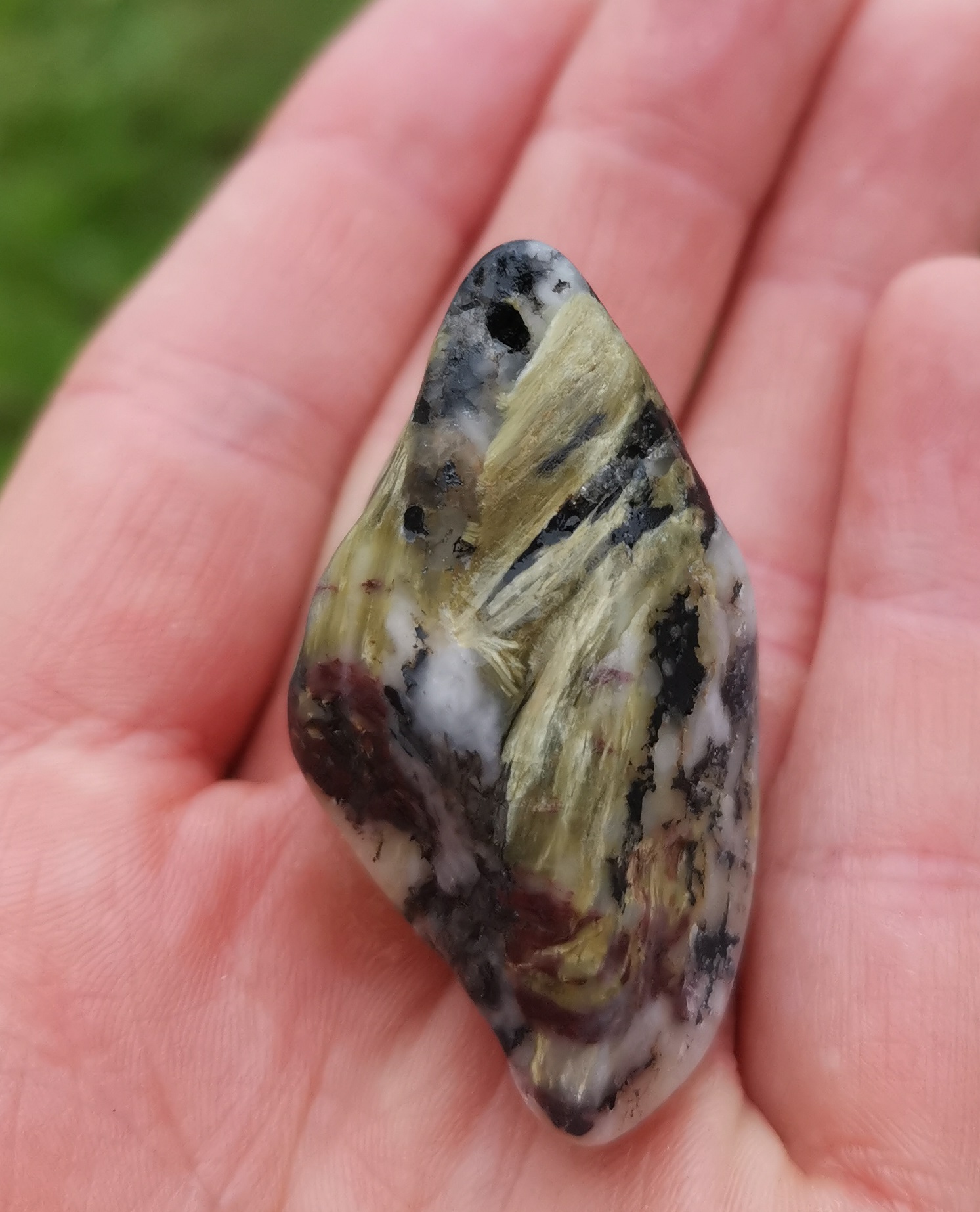 Wer hätte gedacht, dass sich unter dem Stein mit gelben Fasern (ich dachte erst es sei Schwefel) Rutilquarz (mit Engelshaar) versteckt?