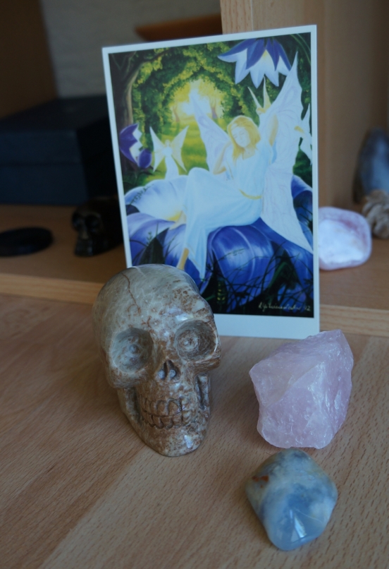 Angereist ist Safira mit einer schönen Postkarte, einem Rosenquarz-Rohstein und einem mir unbekannten Trommler.