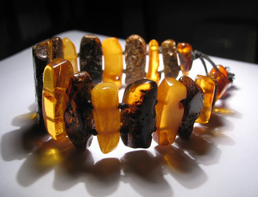 Es gibt das so Armbänder aus Rohbernstein, die sehen aus wie diese Pfähle (Dalben) die man an der See sieht, die so ins Meer reingehen.