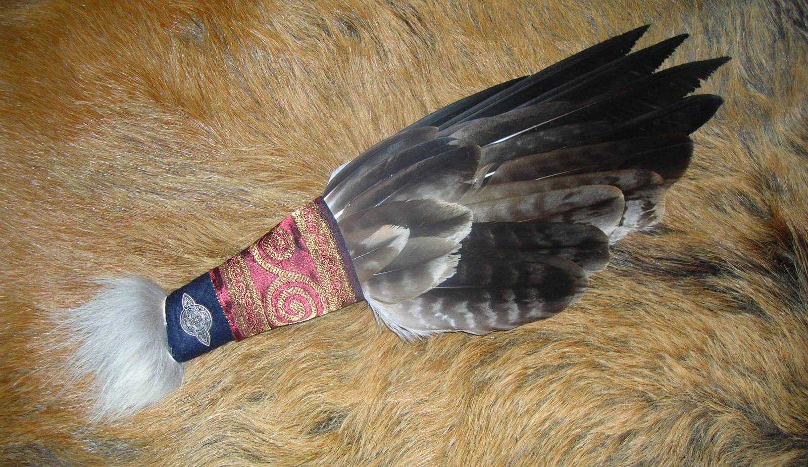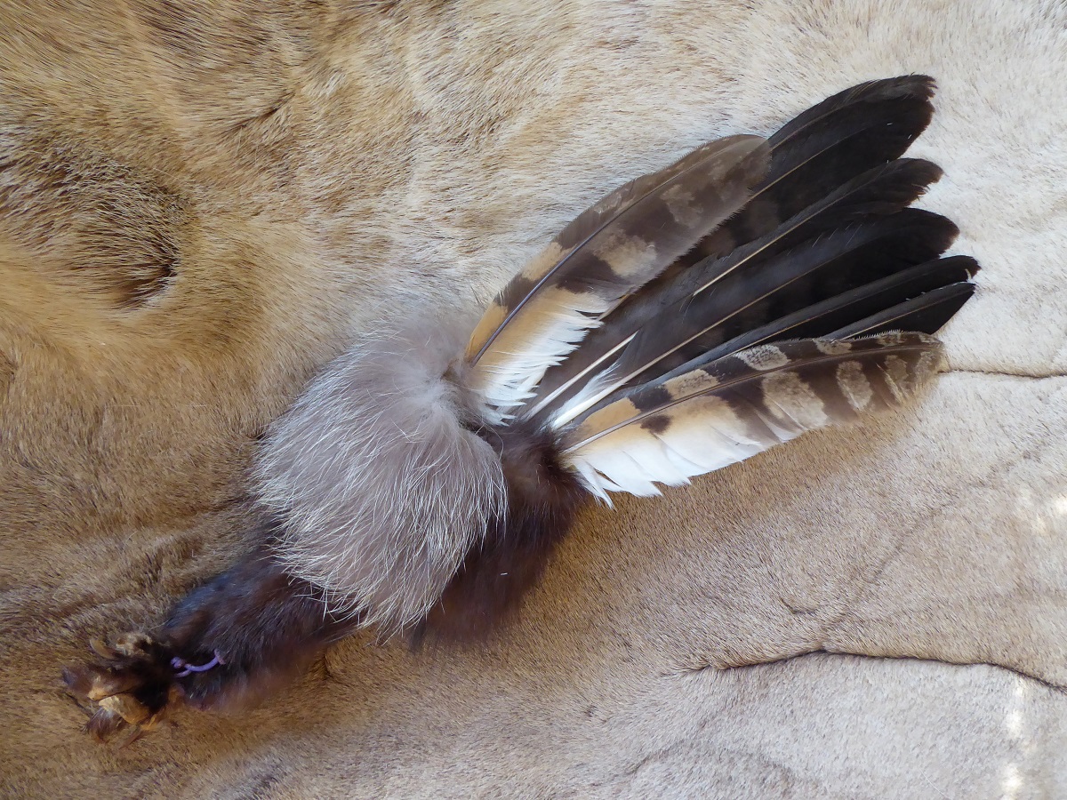 Er ist soweit identisch mit dem Vorgänger, aber die Federn sind besser. Die Federn des ersten waren von Volierenvögeln aus einem Vogelpark - diese Federn dagegen sind von einem Vogel, den der Falkner täglich fliegt. Das heißt, die Spitzen der Federn sind auch diesmal etwas abgenutzt, aber halt nicht abgestoßen, so wie es bei der ersten Version gewesen war (auch wenn es nicht arg gestört hat).