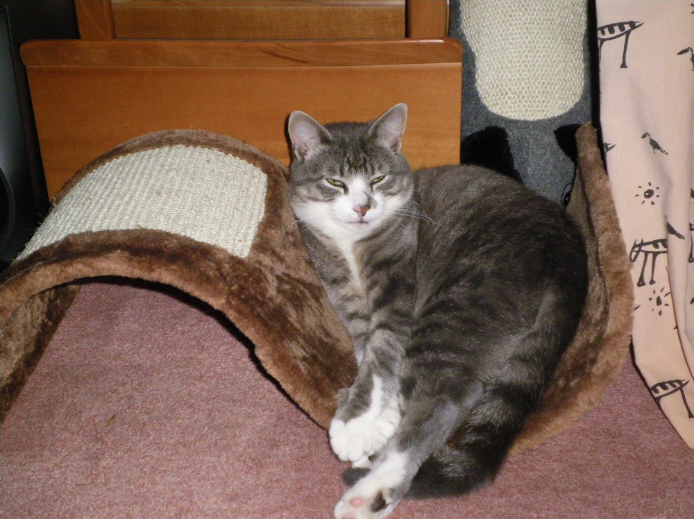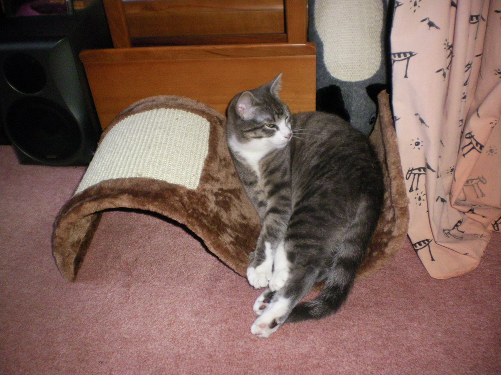 Er kratzt (damit markiert er sein Revier) meißtens morgens auf dem Teppichboden an der Stelle wo ich jetzt die Welle aufgestellt habe. Letztens habe ich ihn die Welle bearbeiten sehen.