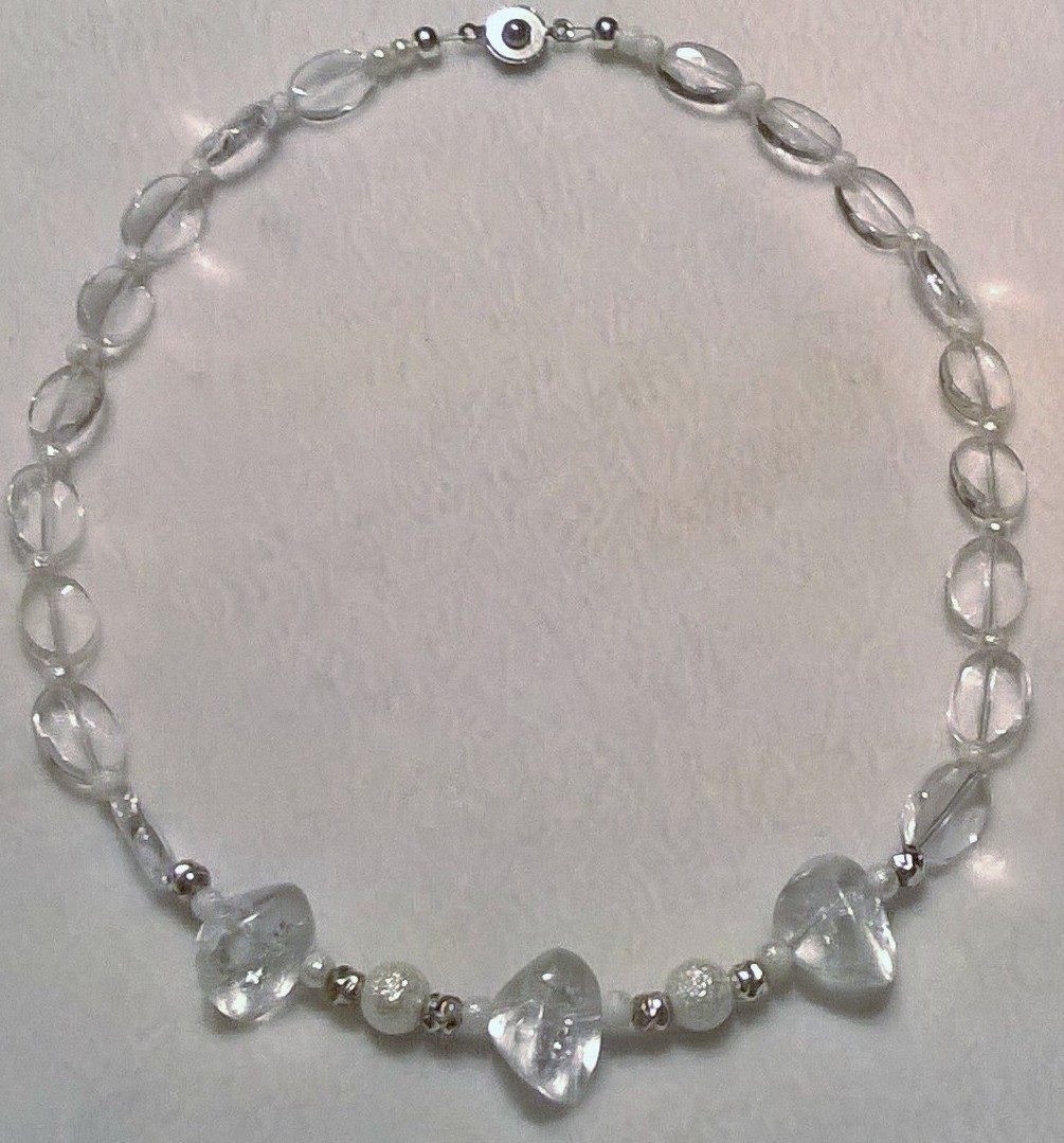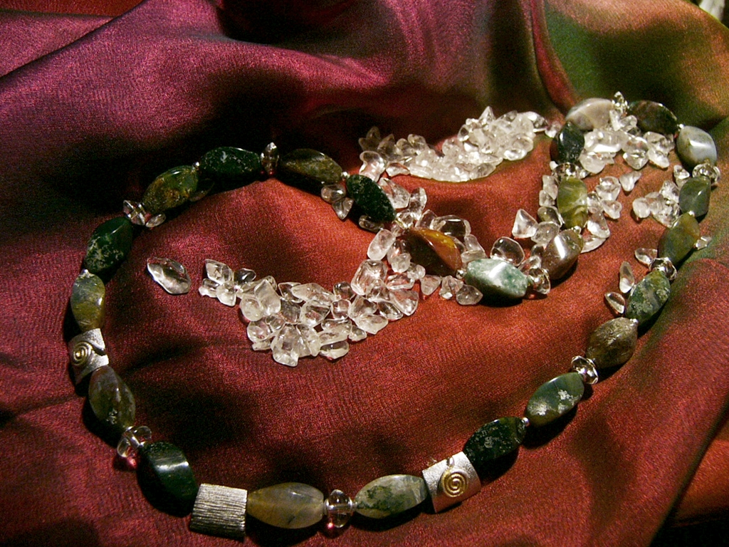 Heute mal eine Kette aus verschieden farbigen Moosachaten und mit Bergkristall paar Zwischenteilen hergestellt