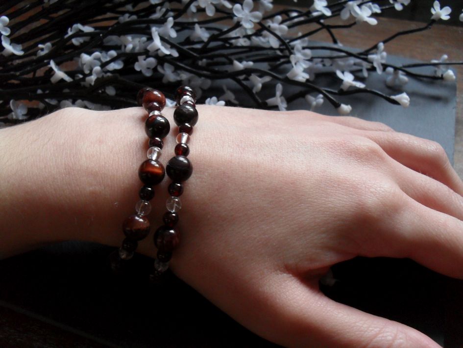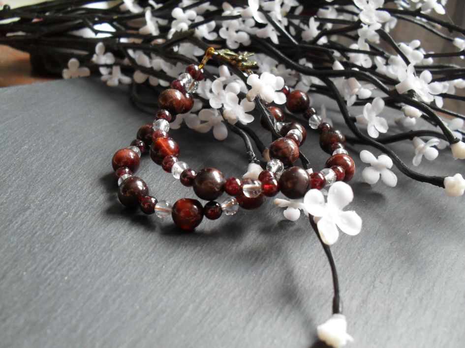 Die Perlen bestehen aus gebranntem Tigereisen, Granat und Bergkristall.