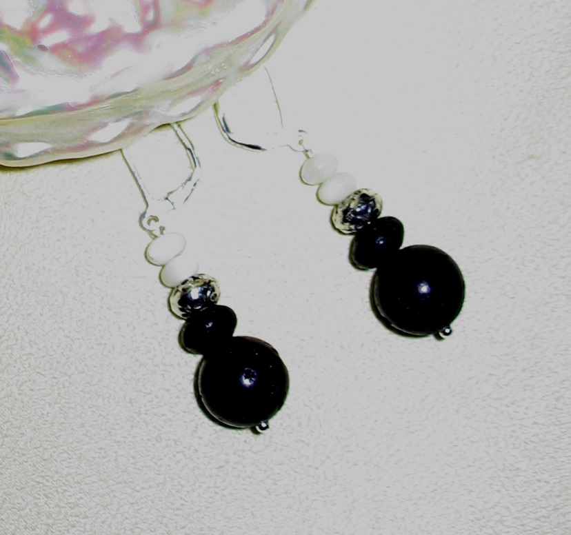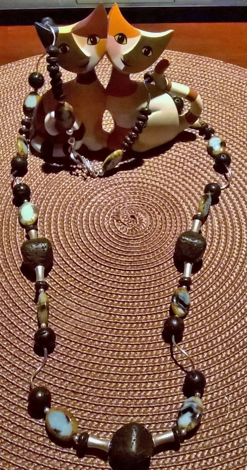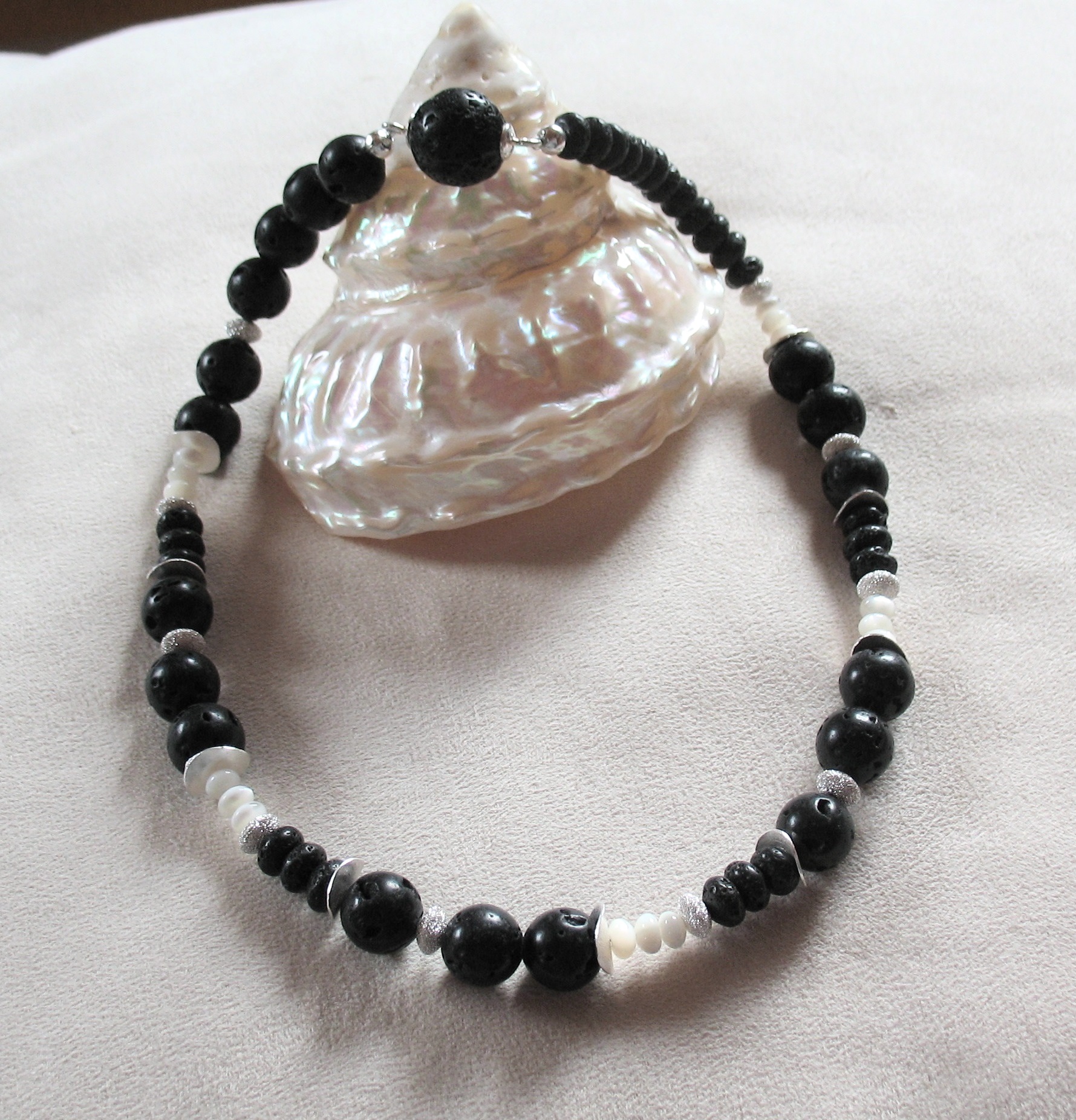 Hier noch etwas aus schwarzer Lava mit Perlmutt- und Silberperlen.
