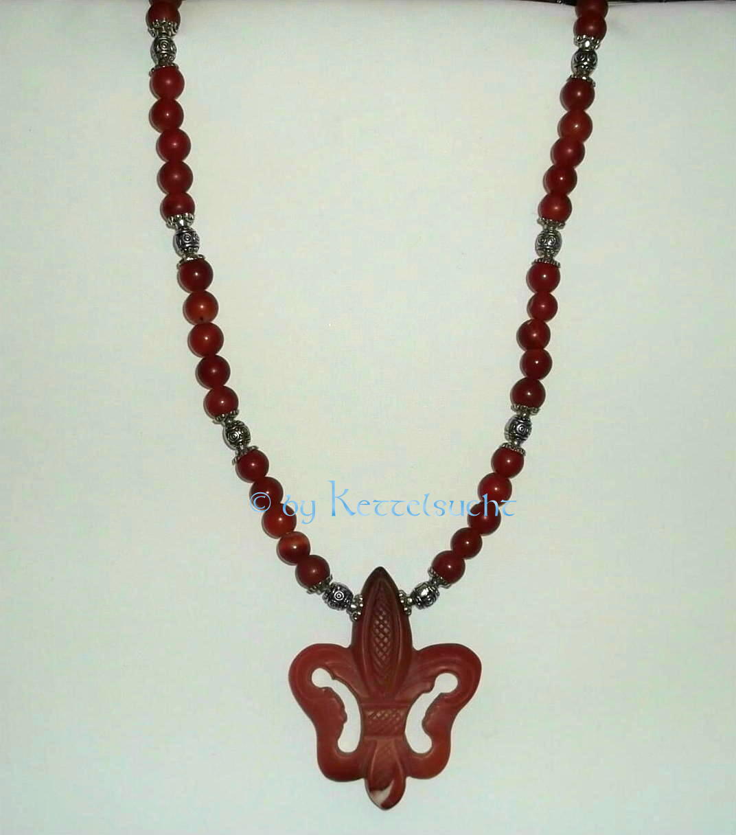 dunkler, matter Karneol als 8mm Perlen mit 6cm langem und 5cm breitem Anhänger..