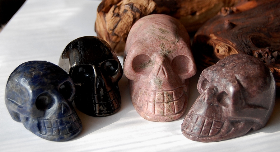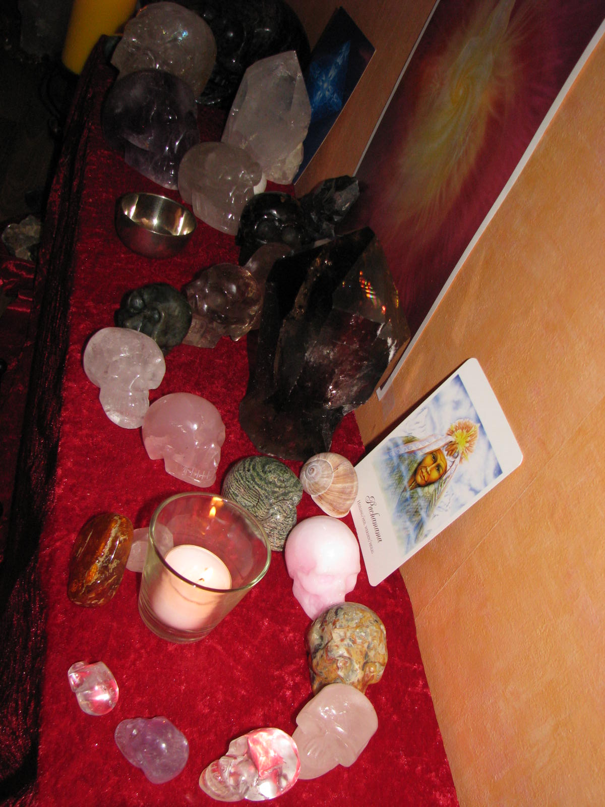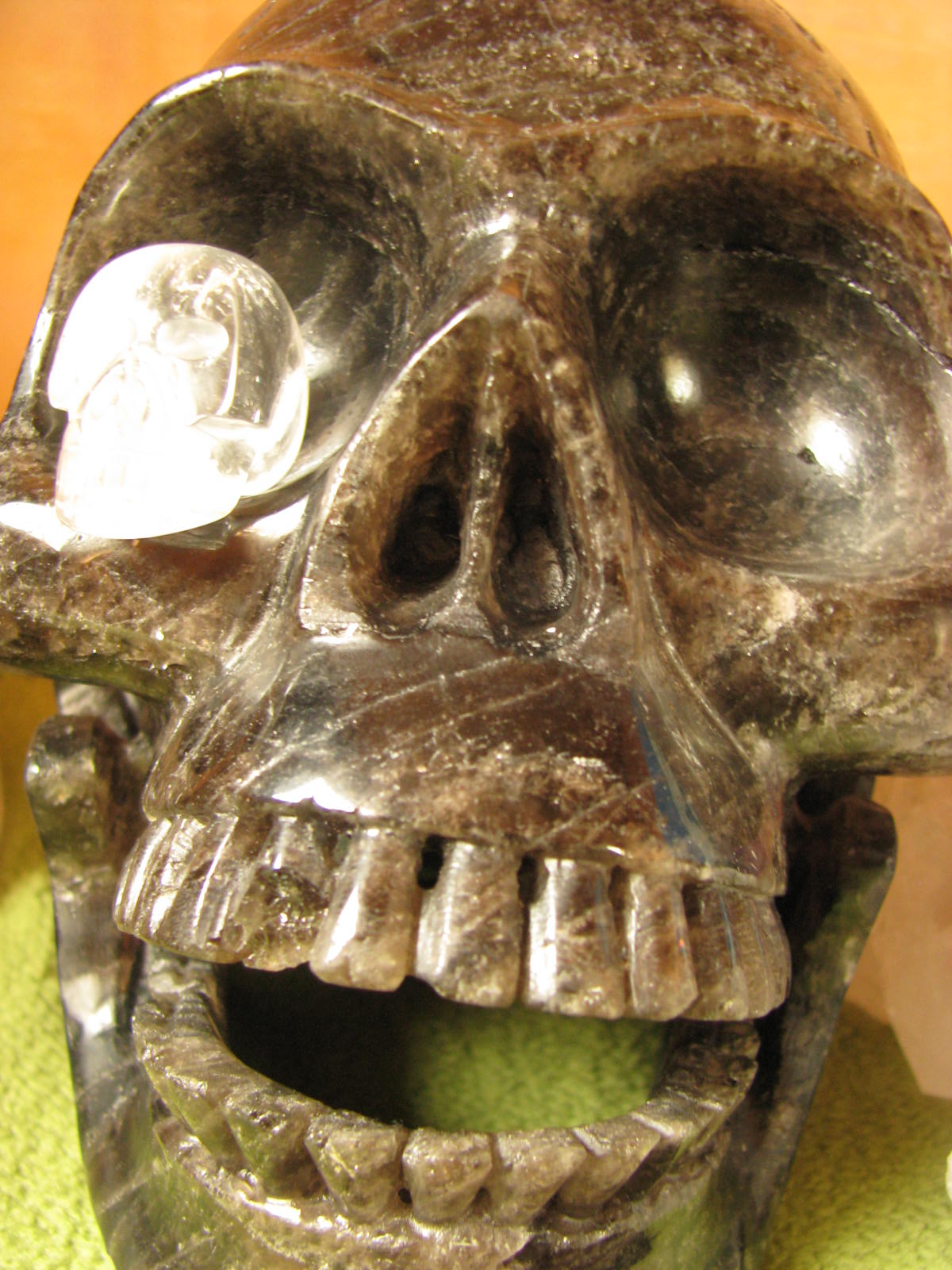 Beim Amethyst-Skull links sieht man gut seine Kuhle auf der Stirn, sein drittes Auge. Wenn ich da einen Fingerkuppe drauf lege, strömt/fließt ganz stark Energie.