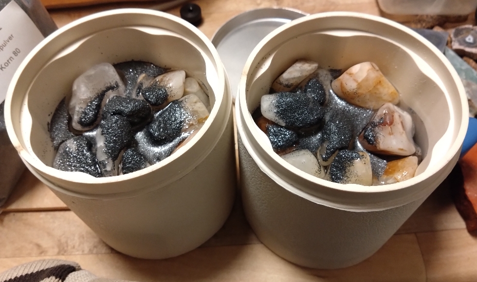 Entschieden habe ich mich für das Modell mit zwei Trommeln von Homberg & Brosius. Damit können fast 2 kg auf einmal bearbeitet werden. Heute Mittag habe ich sie jetzt zum ersten mal in Betrieb genommen und sie mit Quarzen aus Usingen bestückt.