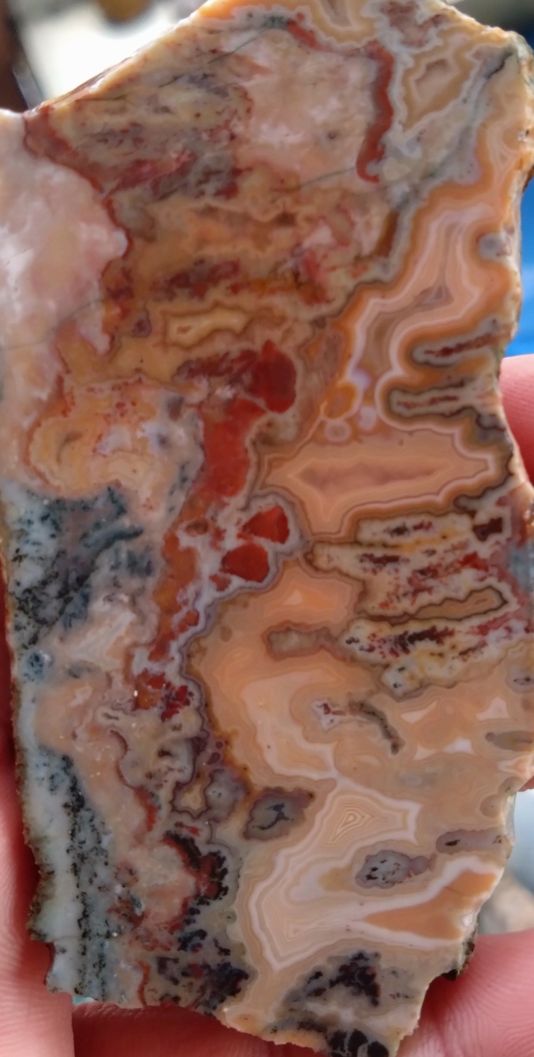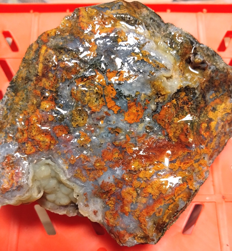 Flammen Achat. Gerade der Bereich mit der Druse würde bestimmt in einem Anhänger sehr schön aussehen. Doch ausgerechnet da ist ein Riss im Stein und ich weiß nicht ob er stabil genug ist. Mal schauen was draus wird ;-)