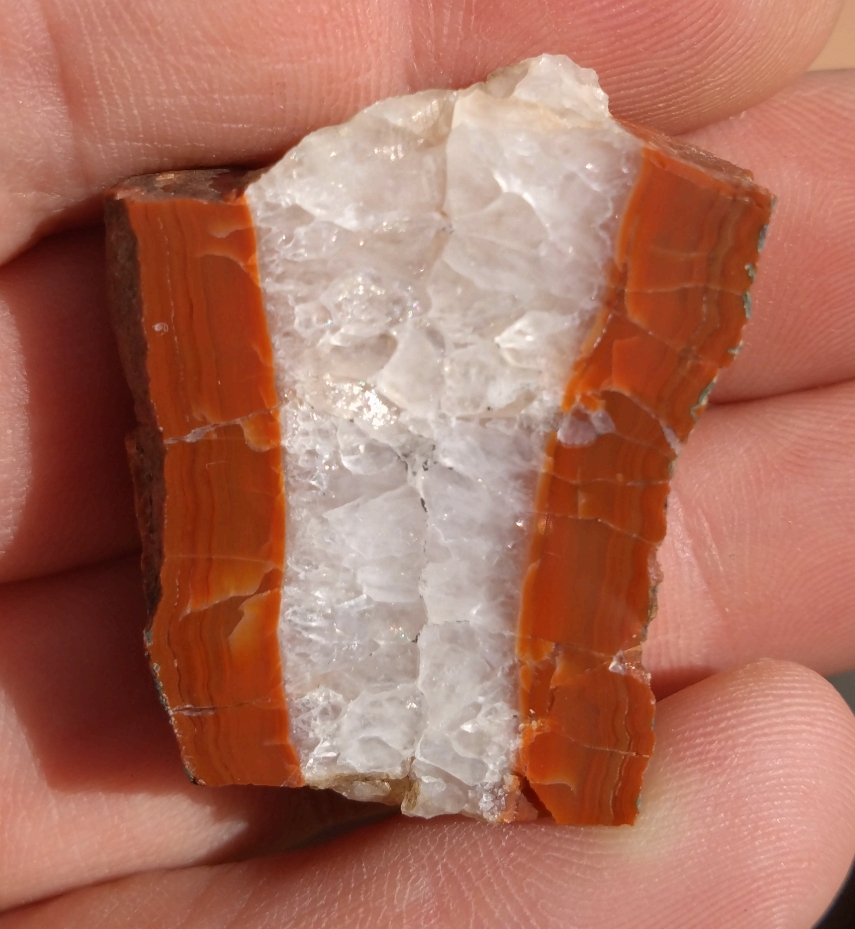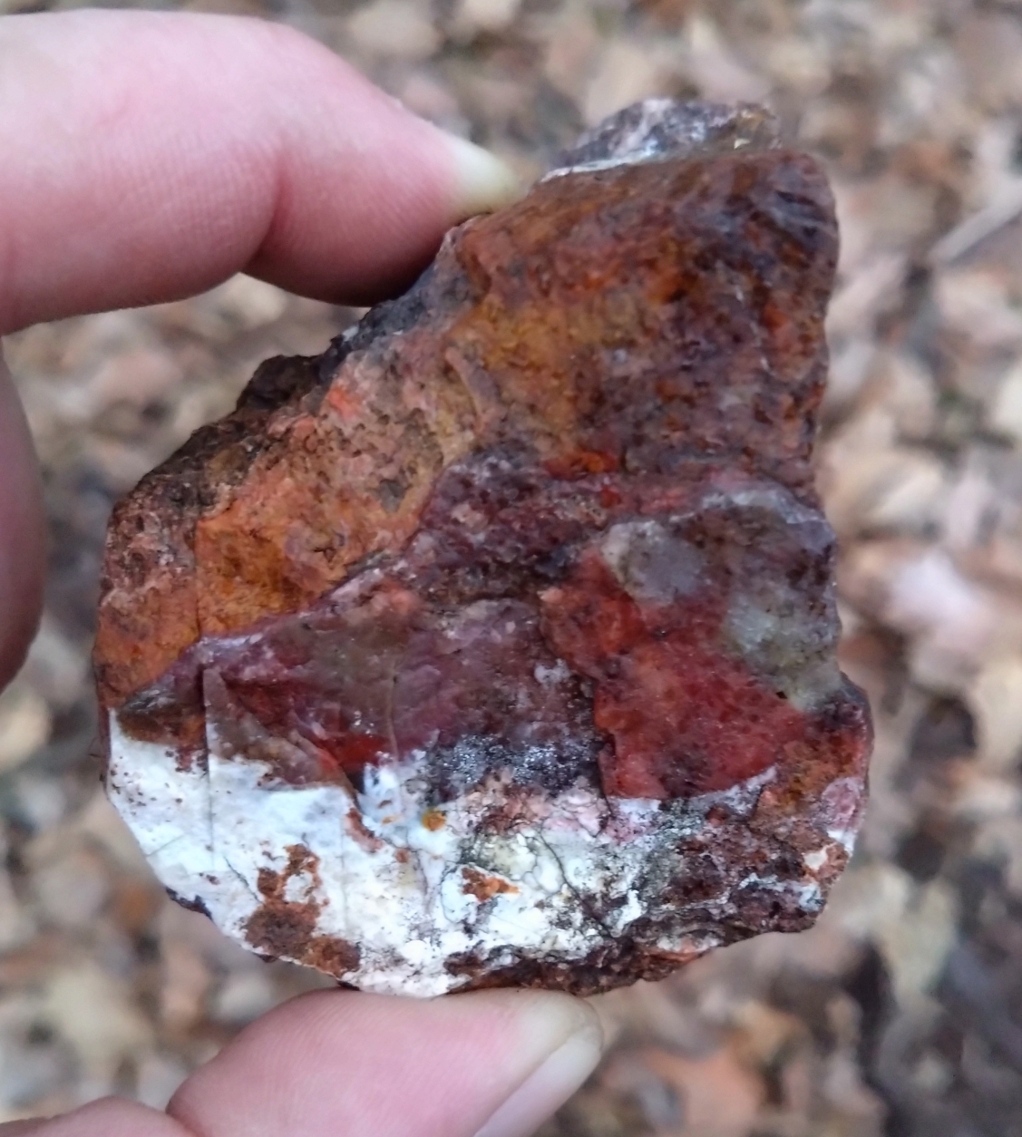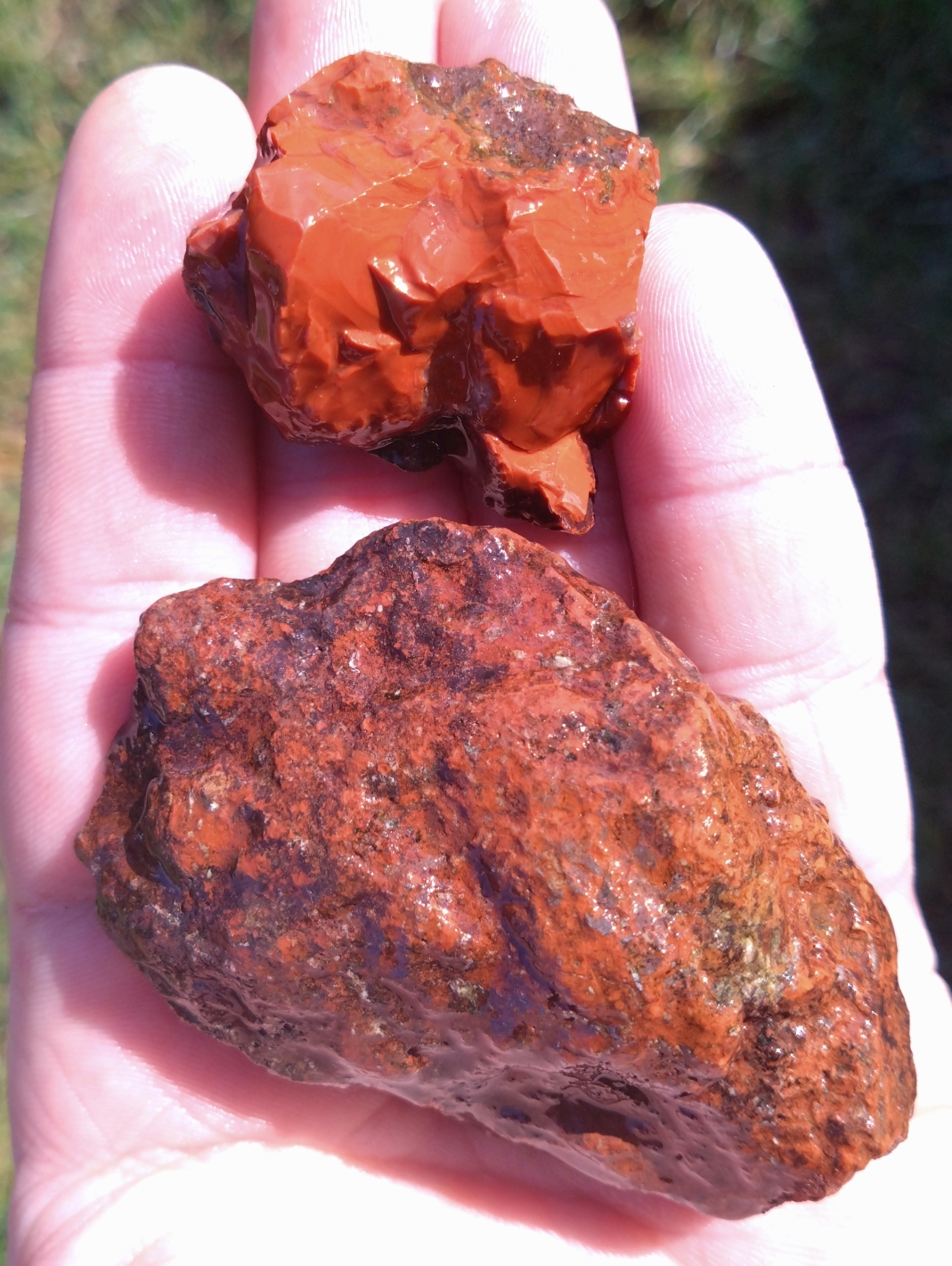 Zunächst einmal zwei schöne Stücke, die ich jedoch nicht mitgenommen habe. Zum einen einen sehr schönen Orange, Rot, Weißen Jaspis, den ich aus dem Grund nicht mitgenommen hatte, da der Jaspis von hier extrem brüchig ist und jede Art der Verarbeitung nur rausgeschmissene Zeit ist.