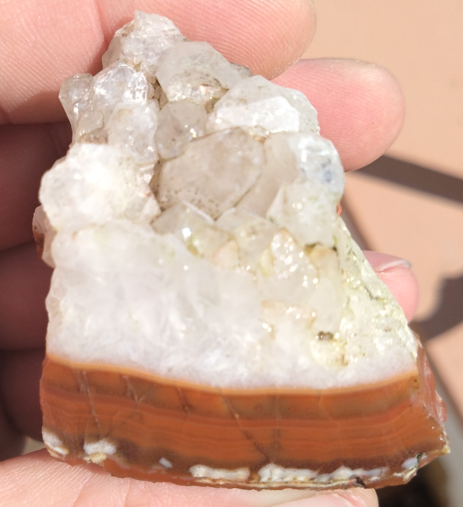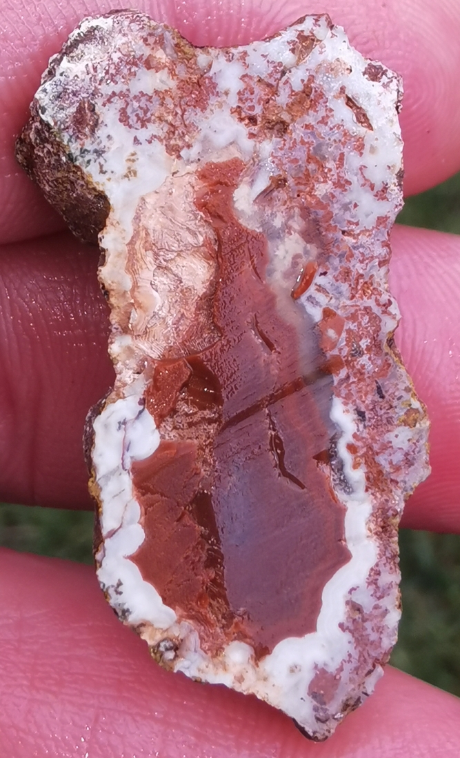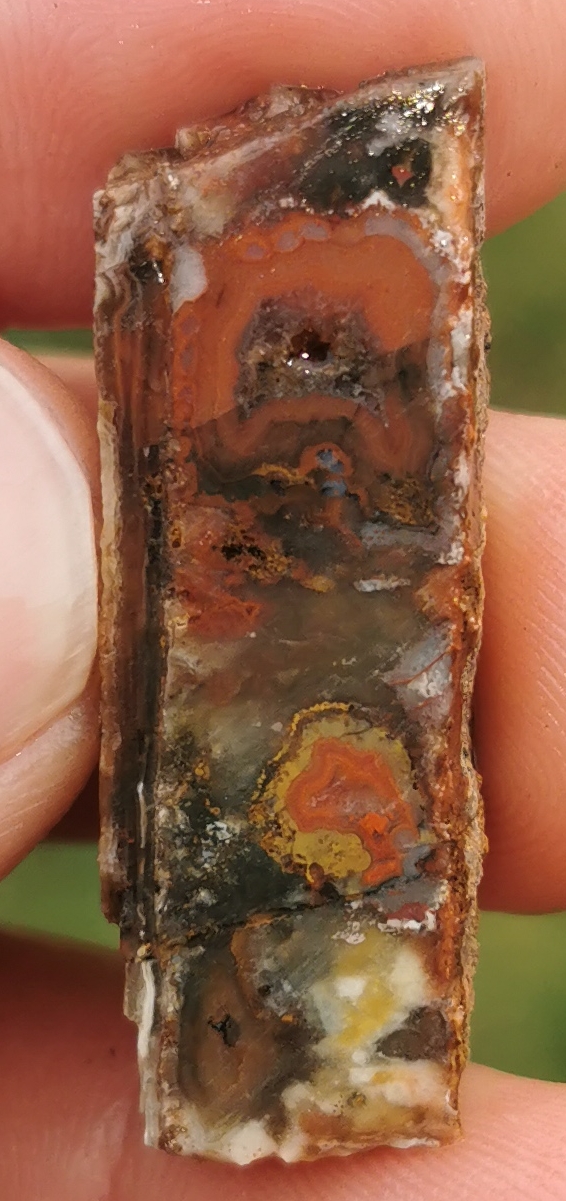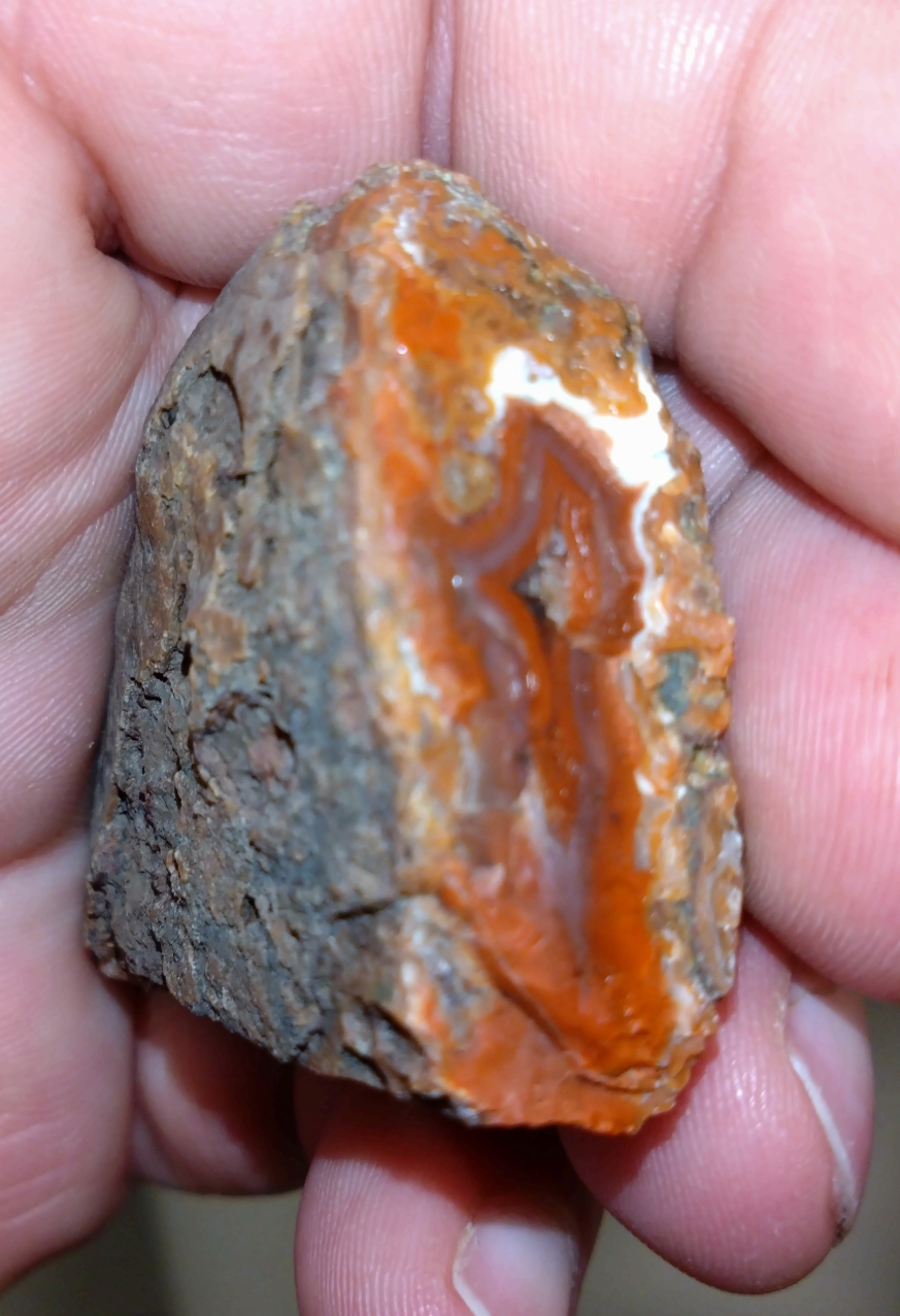 Zunächst einmal zwei schöne Stücke, die ich jedoch nicht mitgenommen habe. Zum einen einen sehr schönen Orange, Rot, Weißen Jaspis, den ich aus dem Grund nicht mitgenommen hatte, da der Jaspis von hier extrem brüchig ist und jede Art der Verarbeitung nur rausgeschmissene Zeit ist.